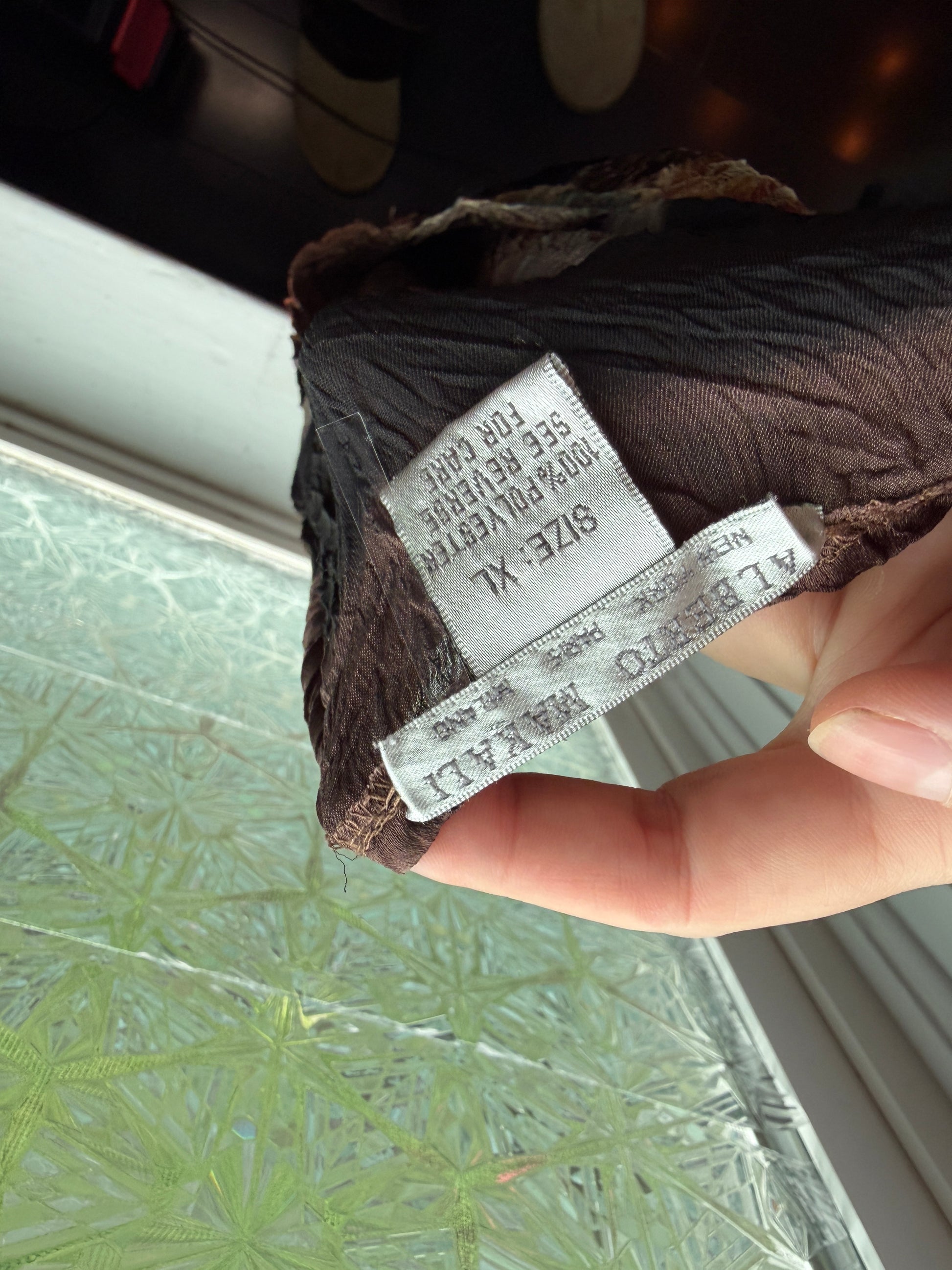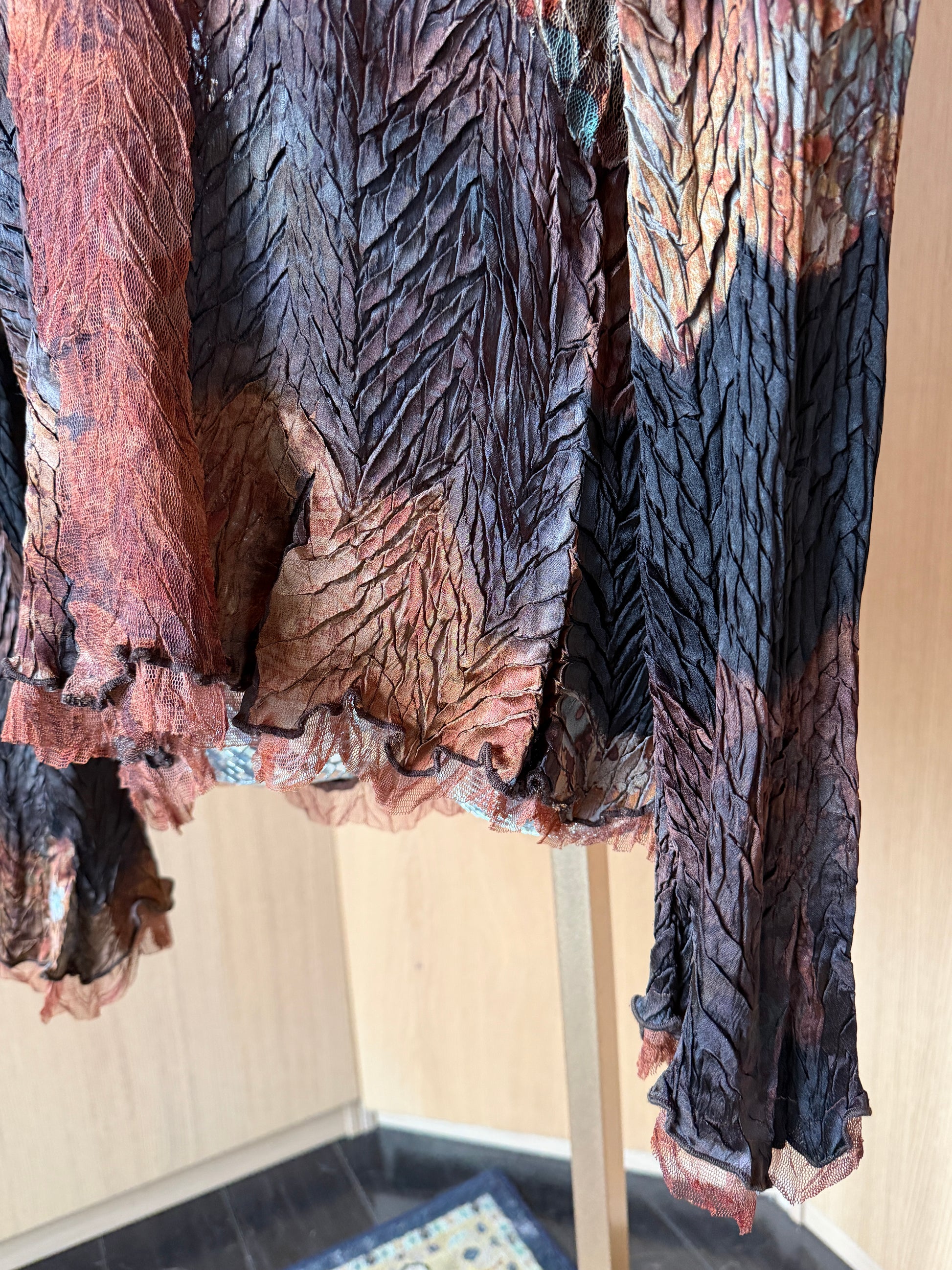 Peak maximalist energy from Alberto Makaliโs signature era โ this feather-swirl crinkle mesh top blends copper, rust, black, and teal in that luxe-boho way he was known for in the mid-2000s. Lightweight, stretchy, and super breathable, it layers beautifully for fall festivals, warm-weather concerts, or any night out where you want texture without bulk. The mesh moves with you and picks up light softly, giving a subtle shimmer effect while dancing. Pair with a silky maxi, battered denim, or wide-leg trousers for that artsy-NYC-boutique vibe.