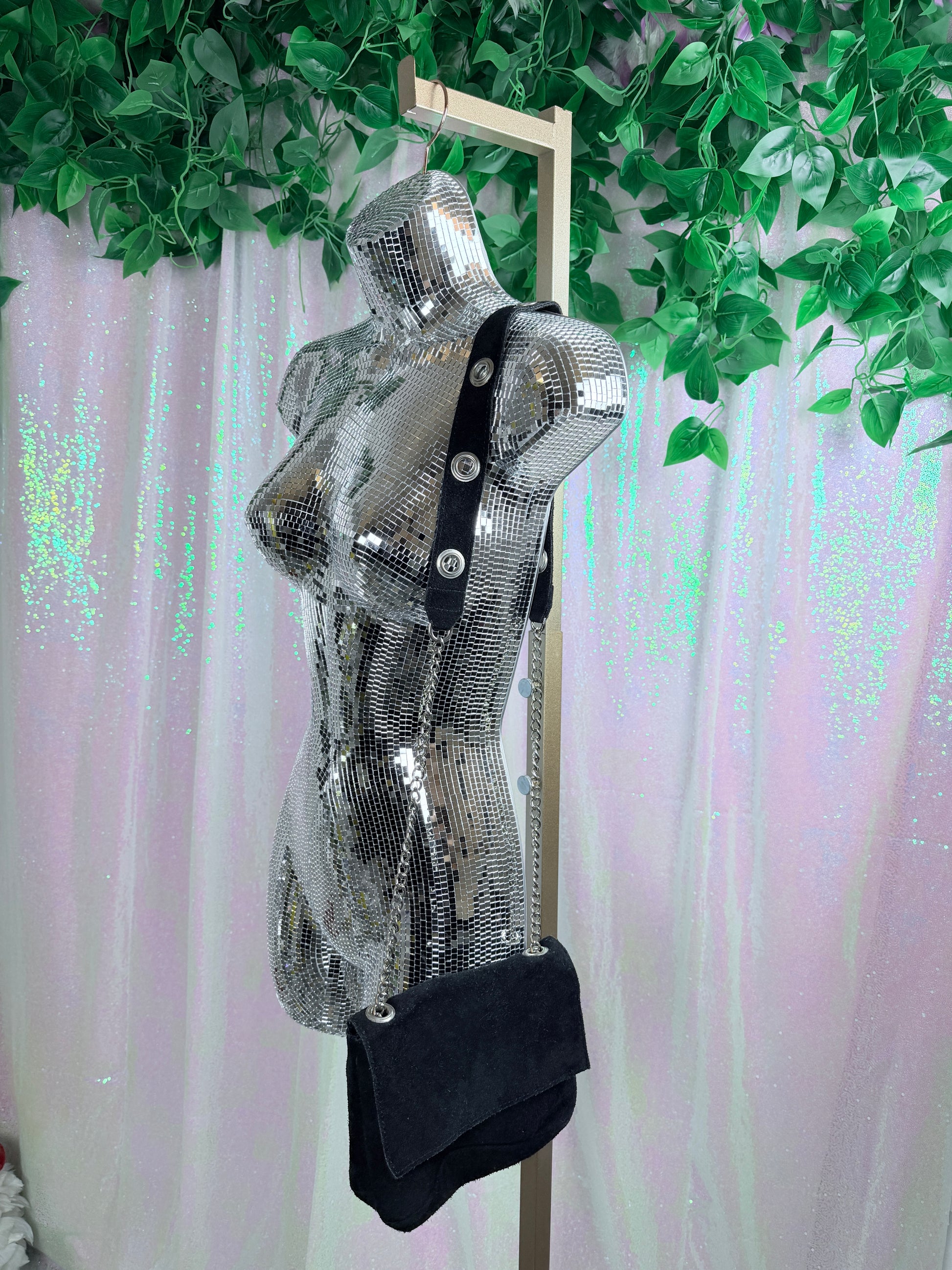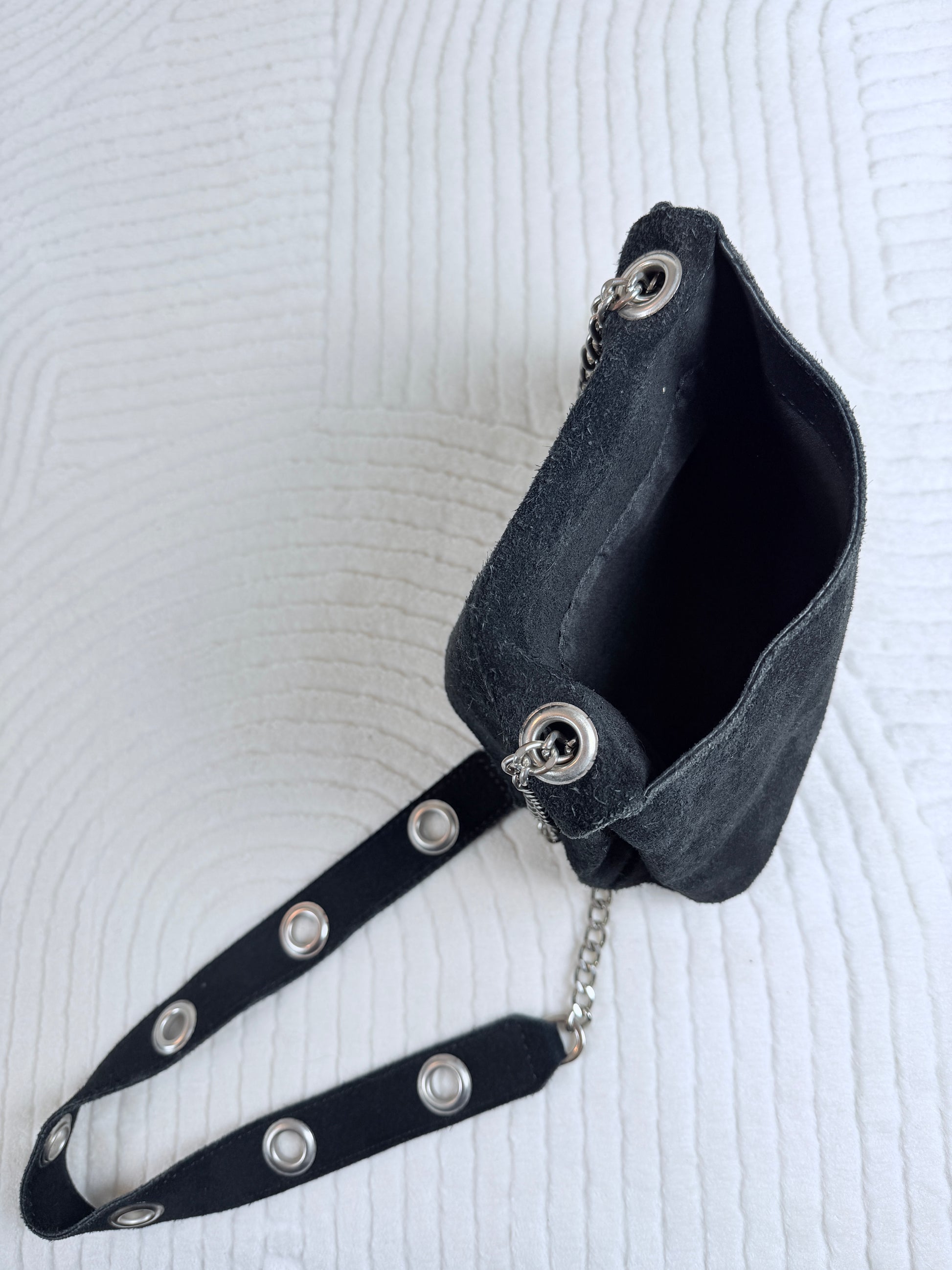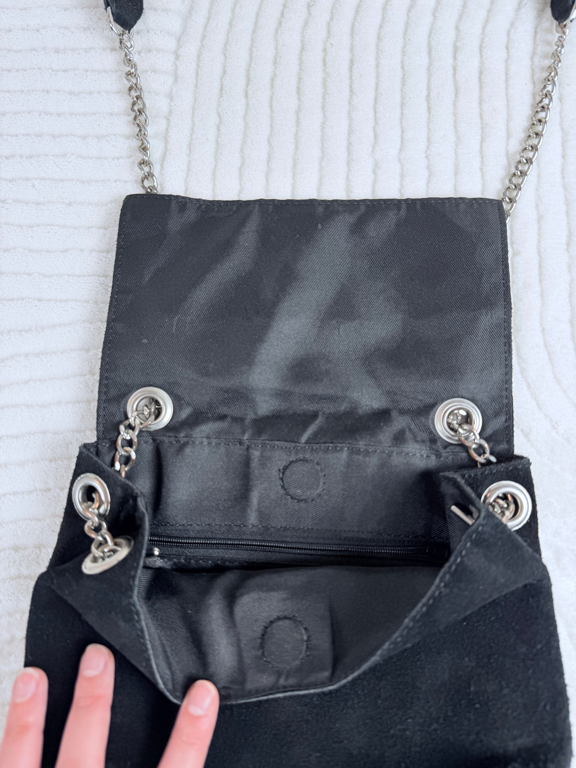 Soft black suede with that classic early-2010s Brandy energy โ the chain strap + grommet shoulder band gives peak Tumblr-era indie sleaze and makes it perfect for concerts, late-night hangs, or festival wandering. surprisingly roomy, with an inner zip pocket so your essentials stay put while you dance or drift through the night.