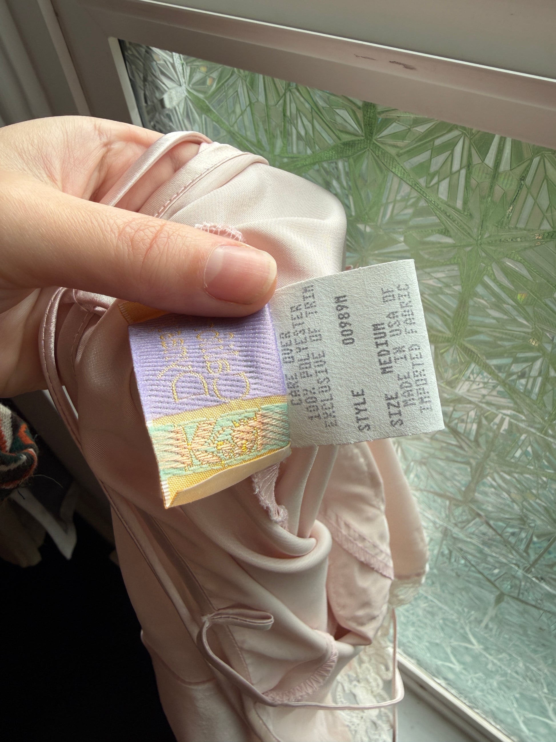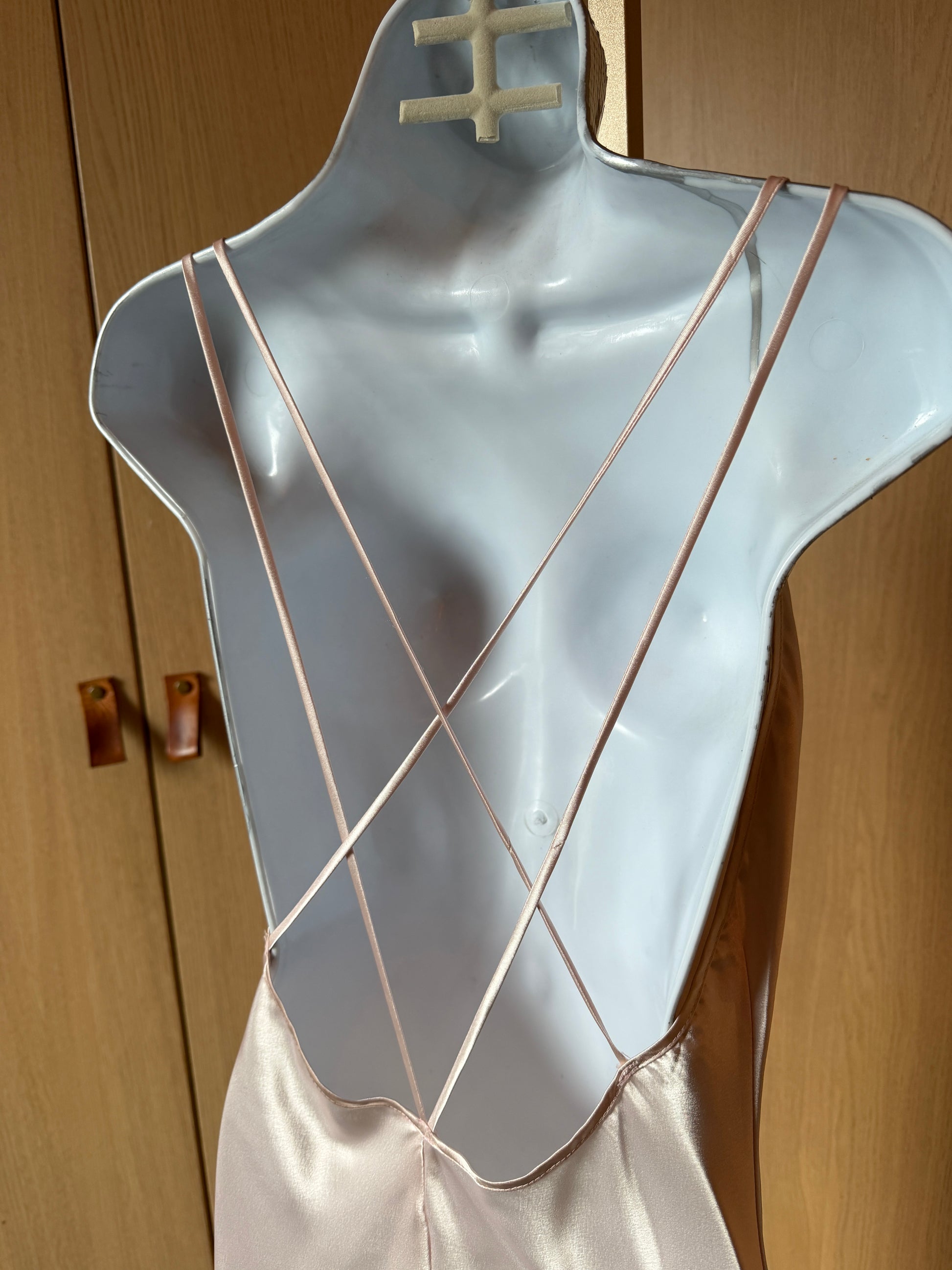 This blush-pink satin slip has a glossy, fluid drape that looks gorgeous in evening light, with delicate white lace and a tiny rose accent that give it peak romantic-festival energy. Lightweight and smooth, it works beautifully for warm-weather shows with a breeze and pairs perfectly with sheer layers, cardigans, or chunky boots for a modern rave-ready look.