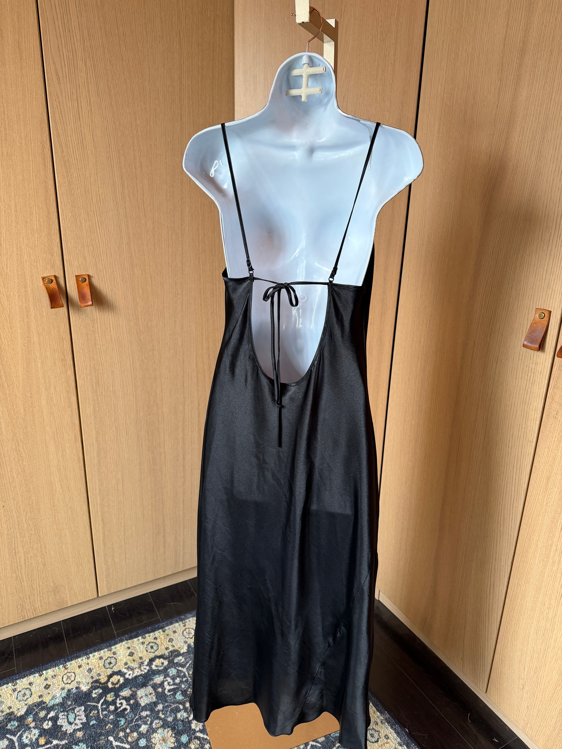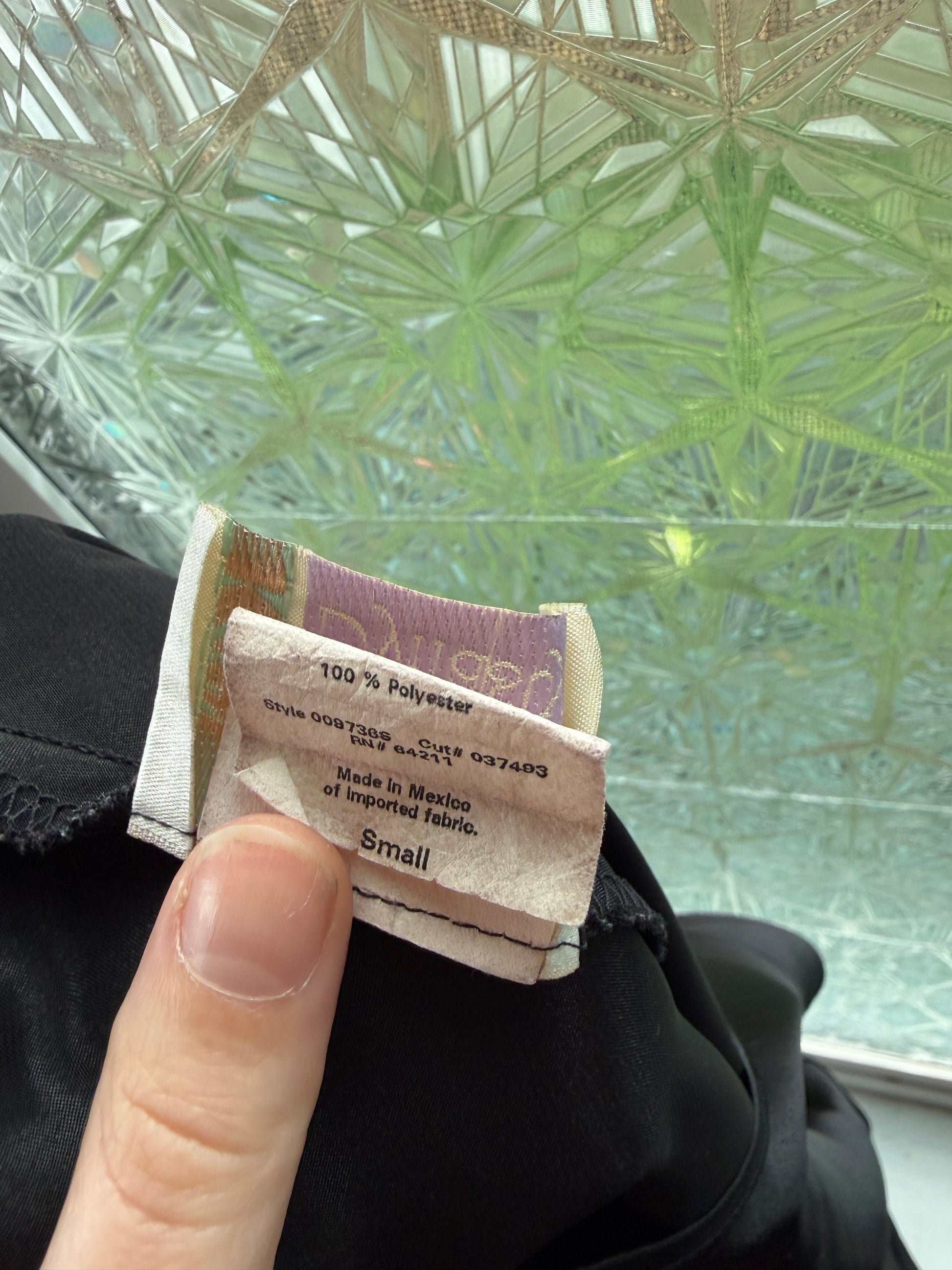 This sleek black maxi-length slip brings pure late-90s “minimalist seduction” energy — glossy satin, delicate spaghetti straps, and a soft cowl-kissed neckline that drapes just right. Likely made between 1996–2002, it’s lightweight with a liquid shine that moves beautifully under lights, making it perfect for evening parties, festivals with a glam tilt, or layering with sheer tops and oversized knits when the weather cools.