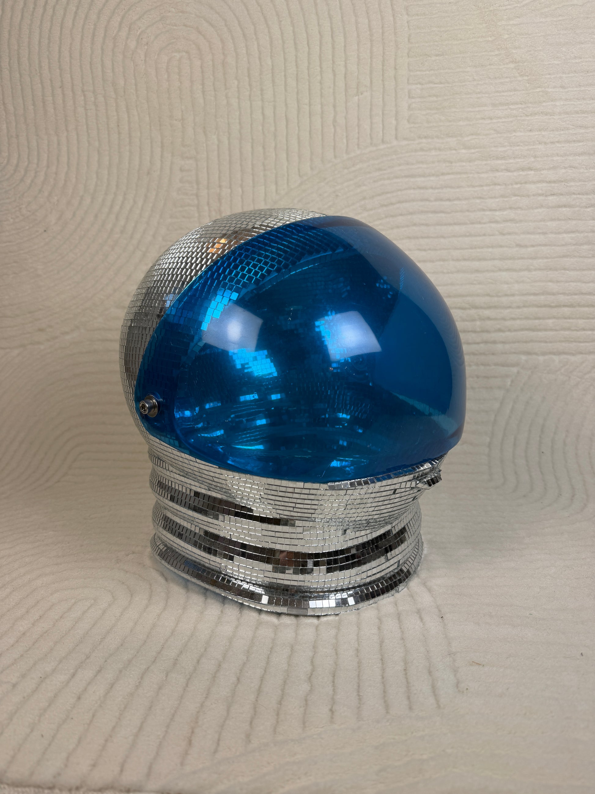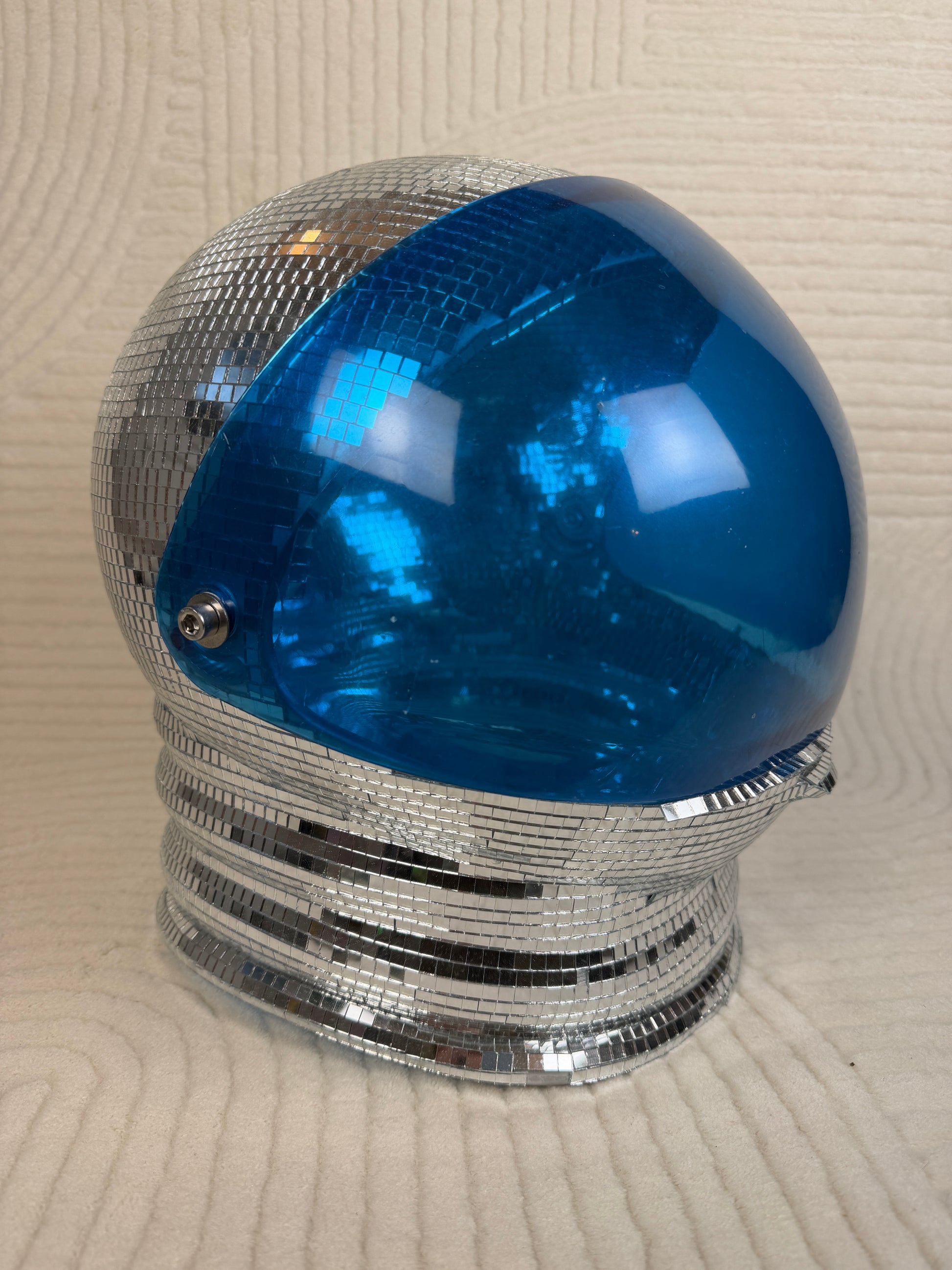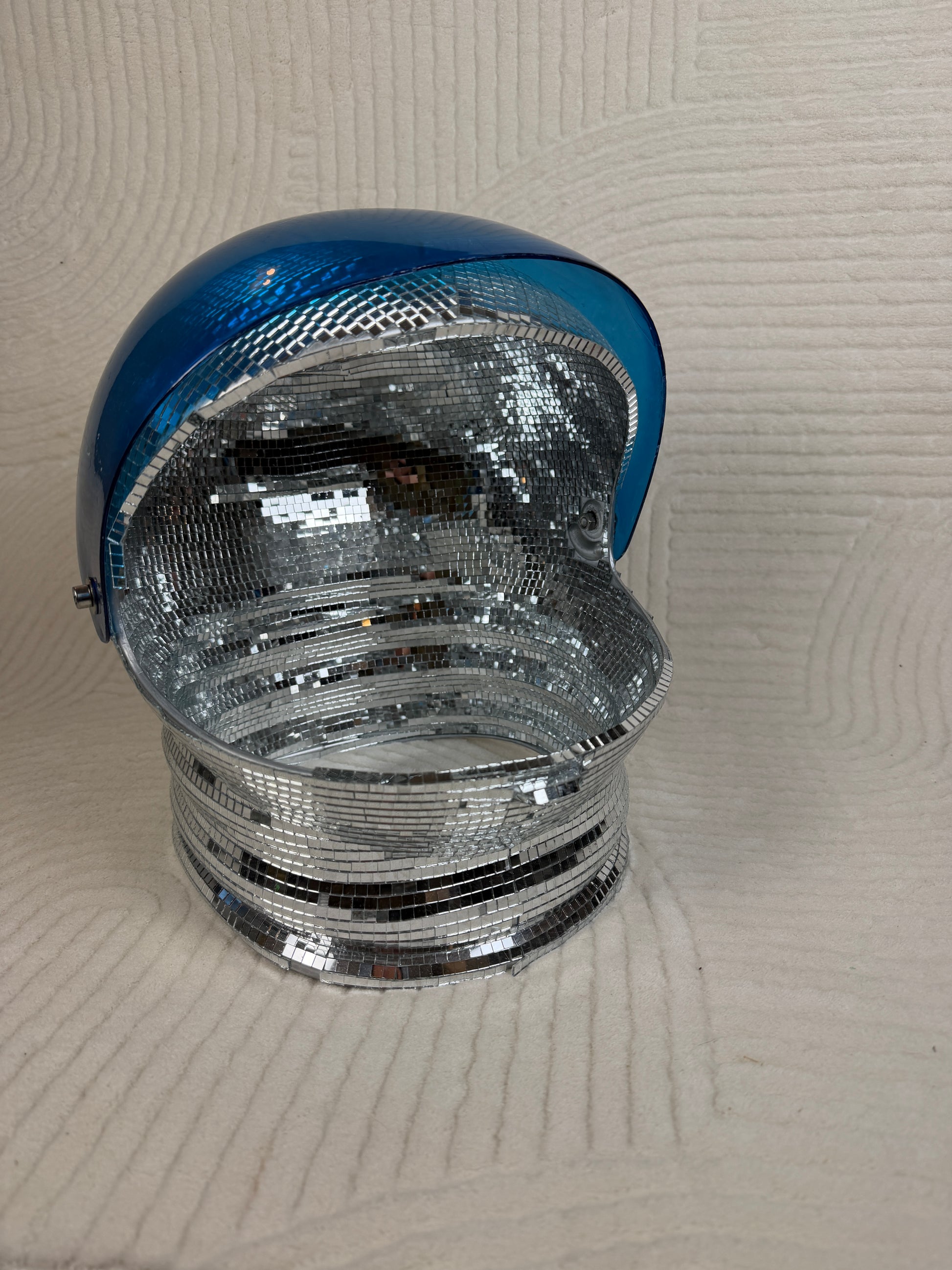 A repurposed astronaut helmet transformed into a shimmering, one-of-one art sculpture. Hand-tiled with micro-mirror disco mosaics and finished with a luminous blue visor, this piece brings full retro-futurist fantasy to any room. Intended for display only โ the interior is fully mirrored, and the tiles would touch your head โ making it a true collectible object rather than wearable gear. A glam-galactic statement for studios, shelves, DJ booths, and VIP corners.