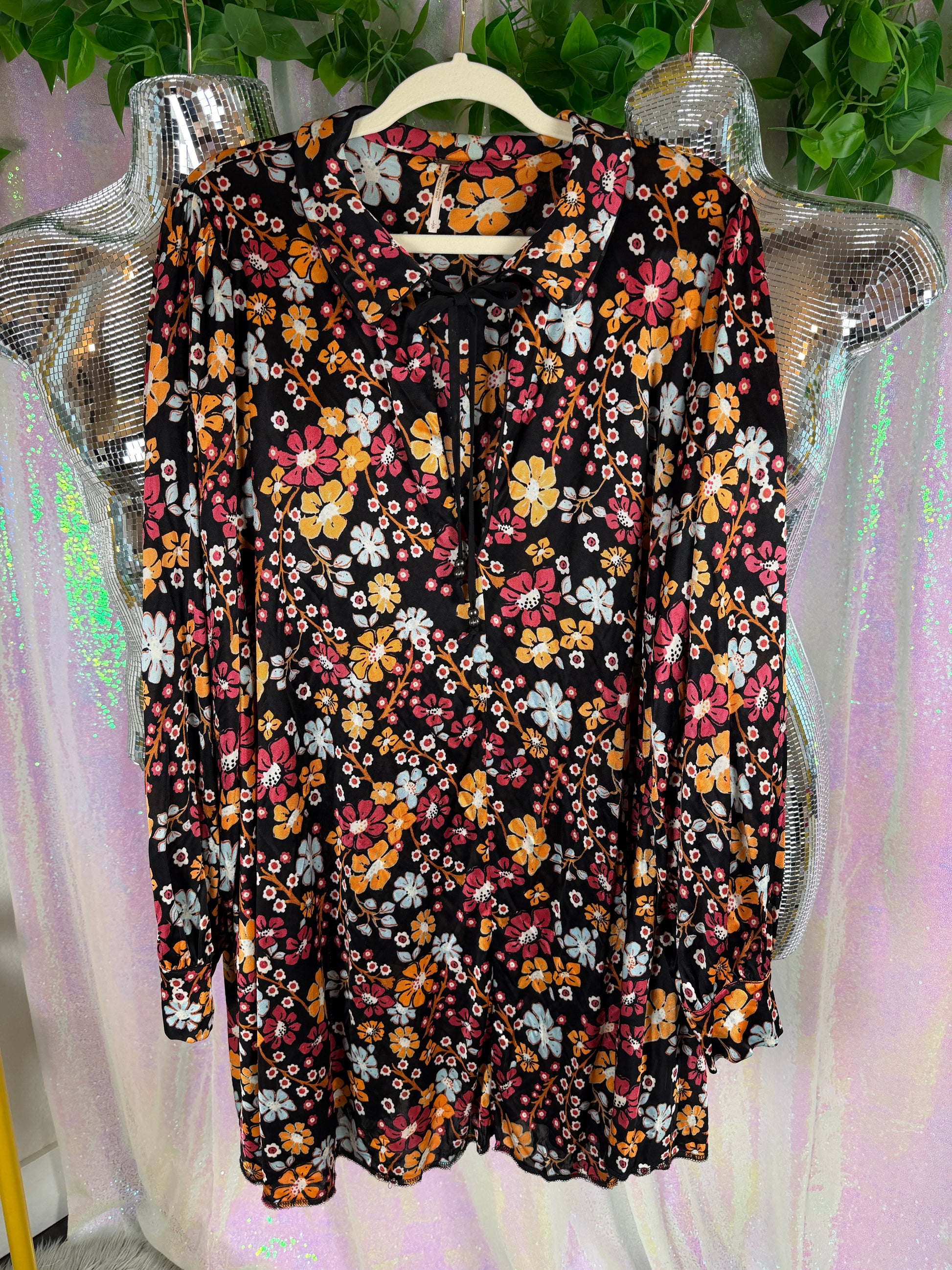 Lightweight with a soft, flowy drape, this early-2000s floral mini features a moody black base layered with warm-toned blooms and a subtle tie neckline that keeps it easy and unfussy. Effortless and wearable—cute with boots, comfy with tights, or styled loose for that lowkey romantic, day-to-night energy.