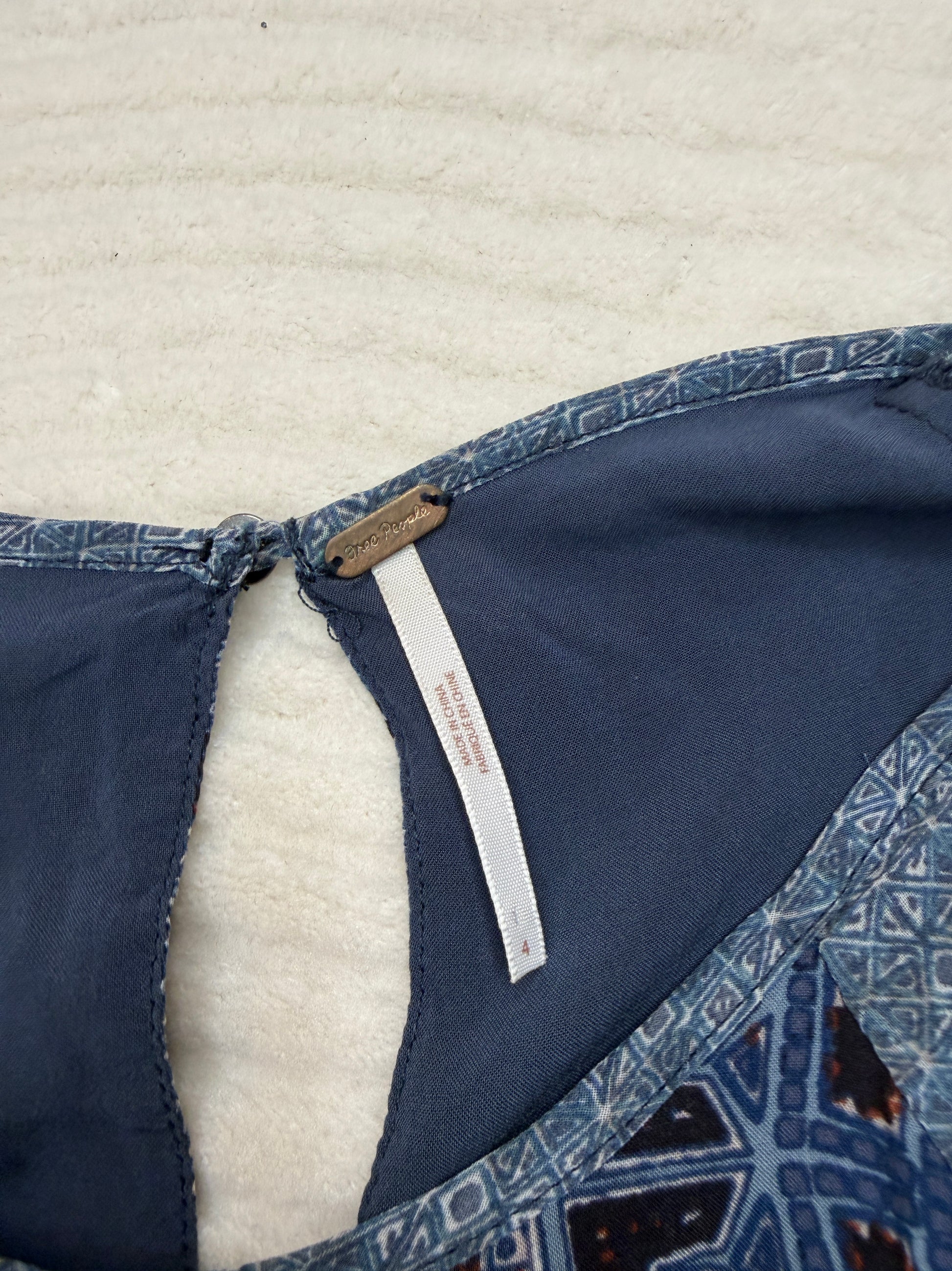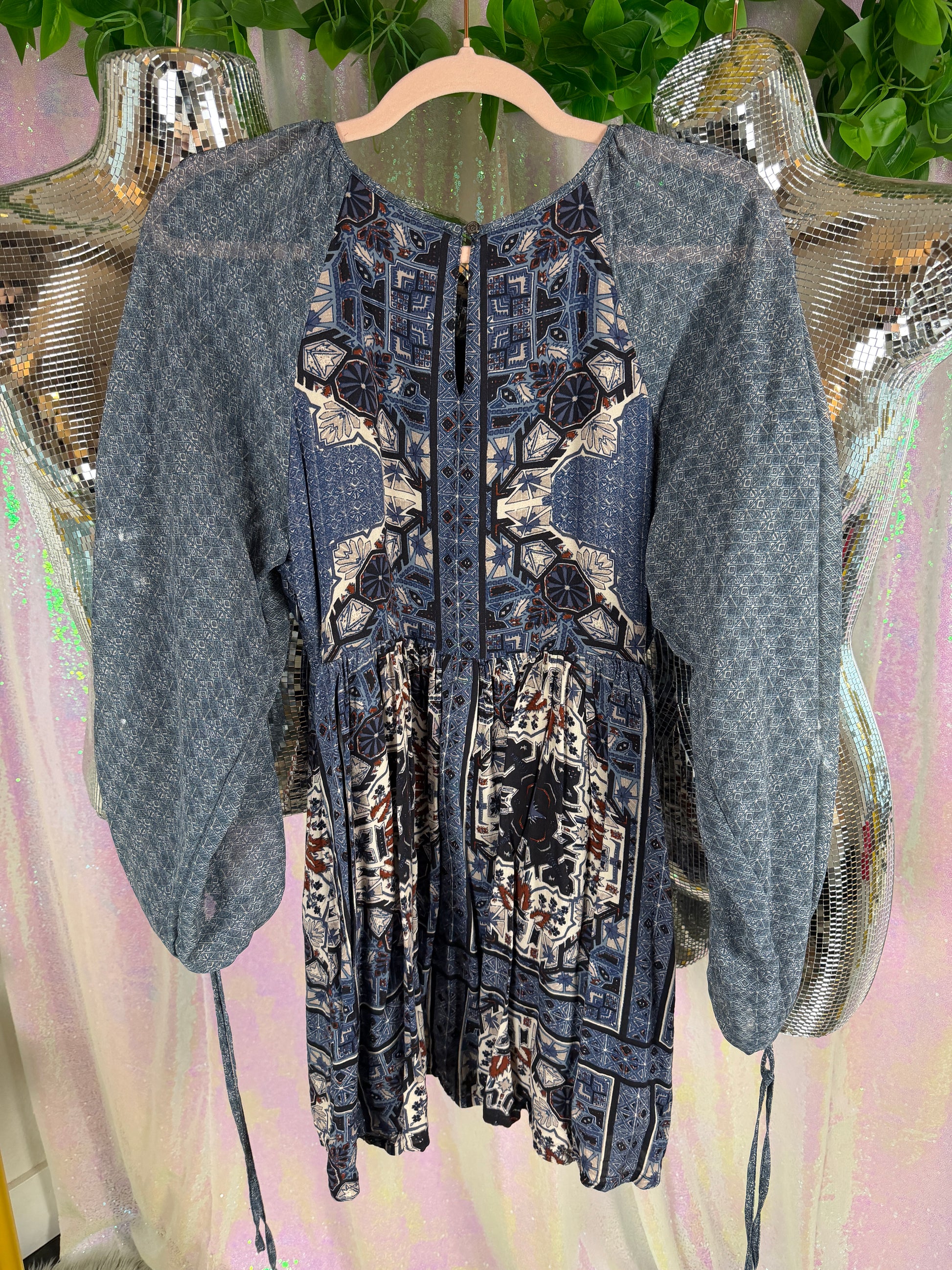 Free People (S) 🌀🫐🌿🧿 mixed-print boho mini dress, washed indigo + slate with earthy accents, folk revival / soft grunge / art-girl layering (factory tagged: XS)