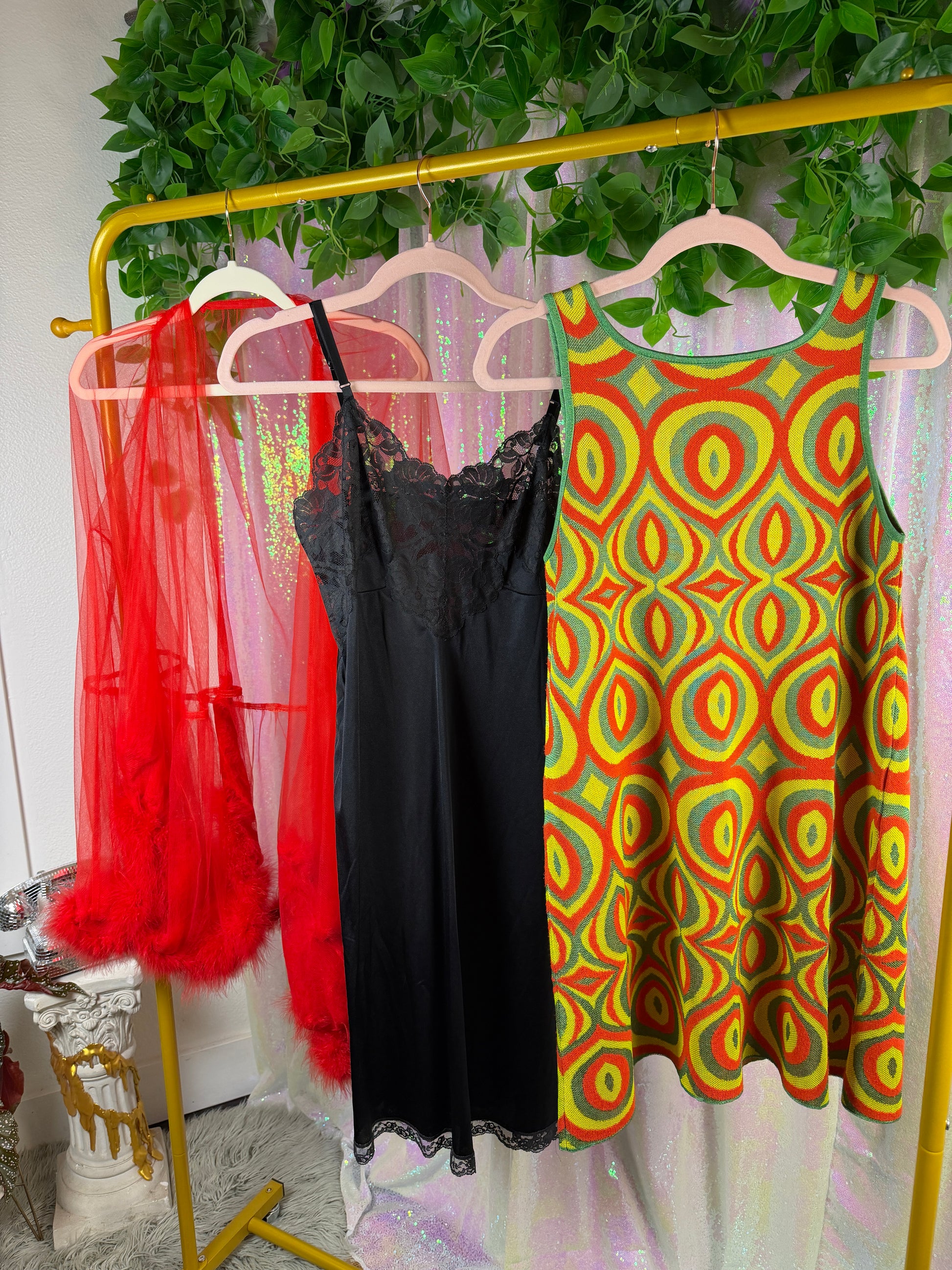 A bold, high-drama trio blending flirty sheer movement with vintage slip energy and a hypnotic 60s knit print. This set shifts effortlessly between coquette, camp, and psychedelic glam โ€” perfect for stage nights, house parties, editorial dressing, or building a statement look out of one star piece. Every item brings its own vibe, but together they read unapologetically loud and irresistibly fun.