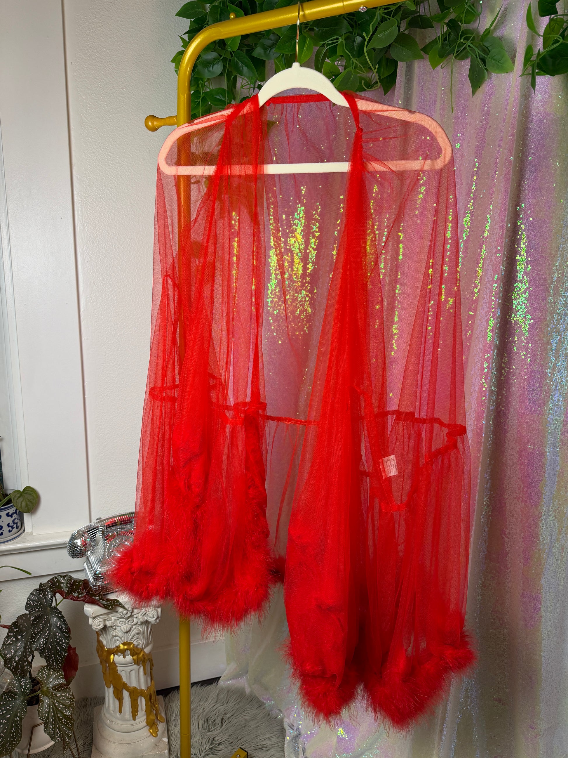 N/A cherry red sheer feather-trim robe (factory tagged: M)