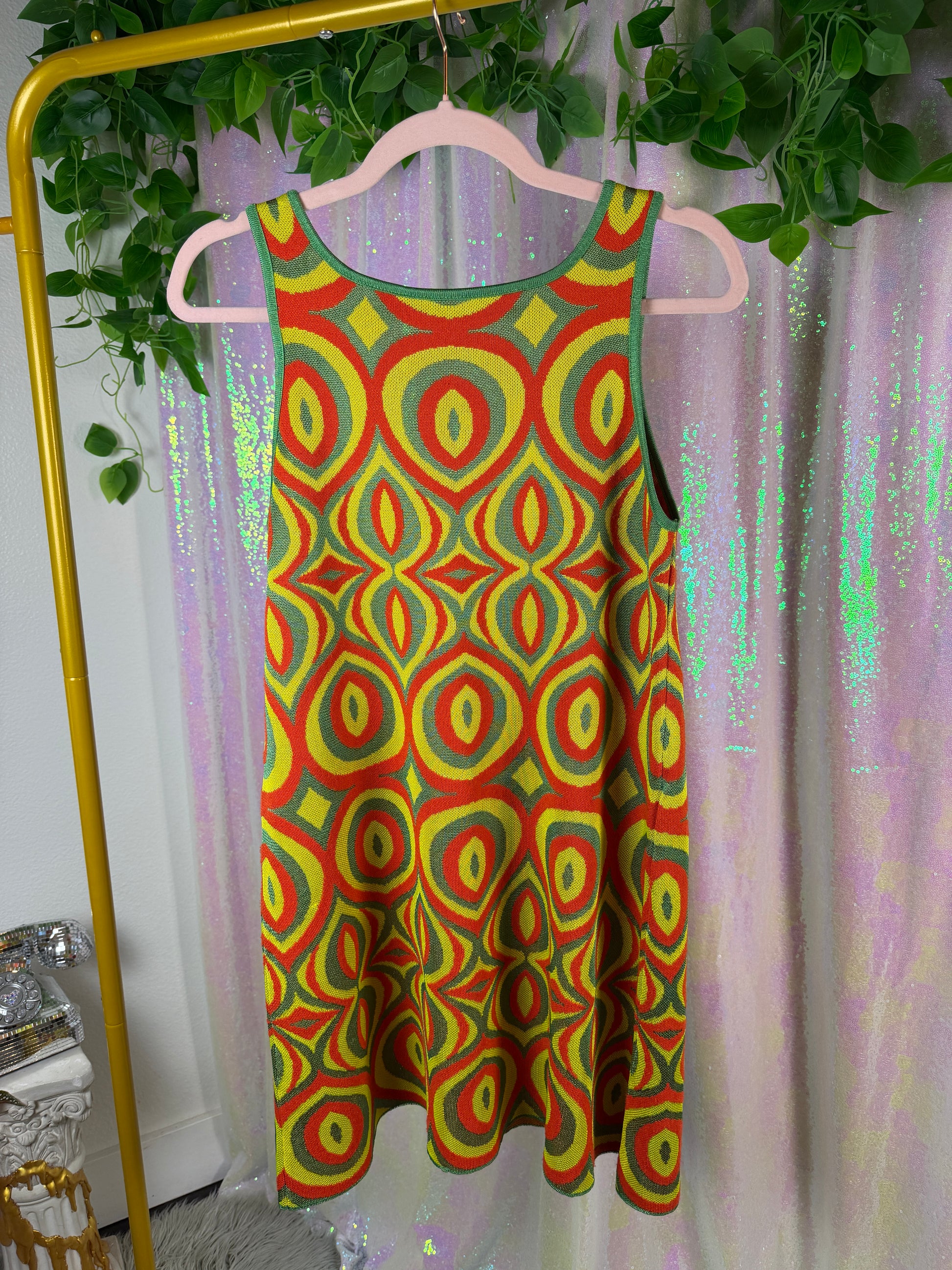 A stretchy 60s-inspired knit mini with a bold mod pattern in lime, orange, and gold. Lightweight with great movement, it channels retro go-go energy while still feeling modern and artistic โ€” a true dopamine piece.