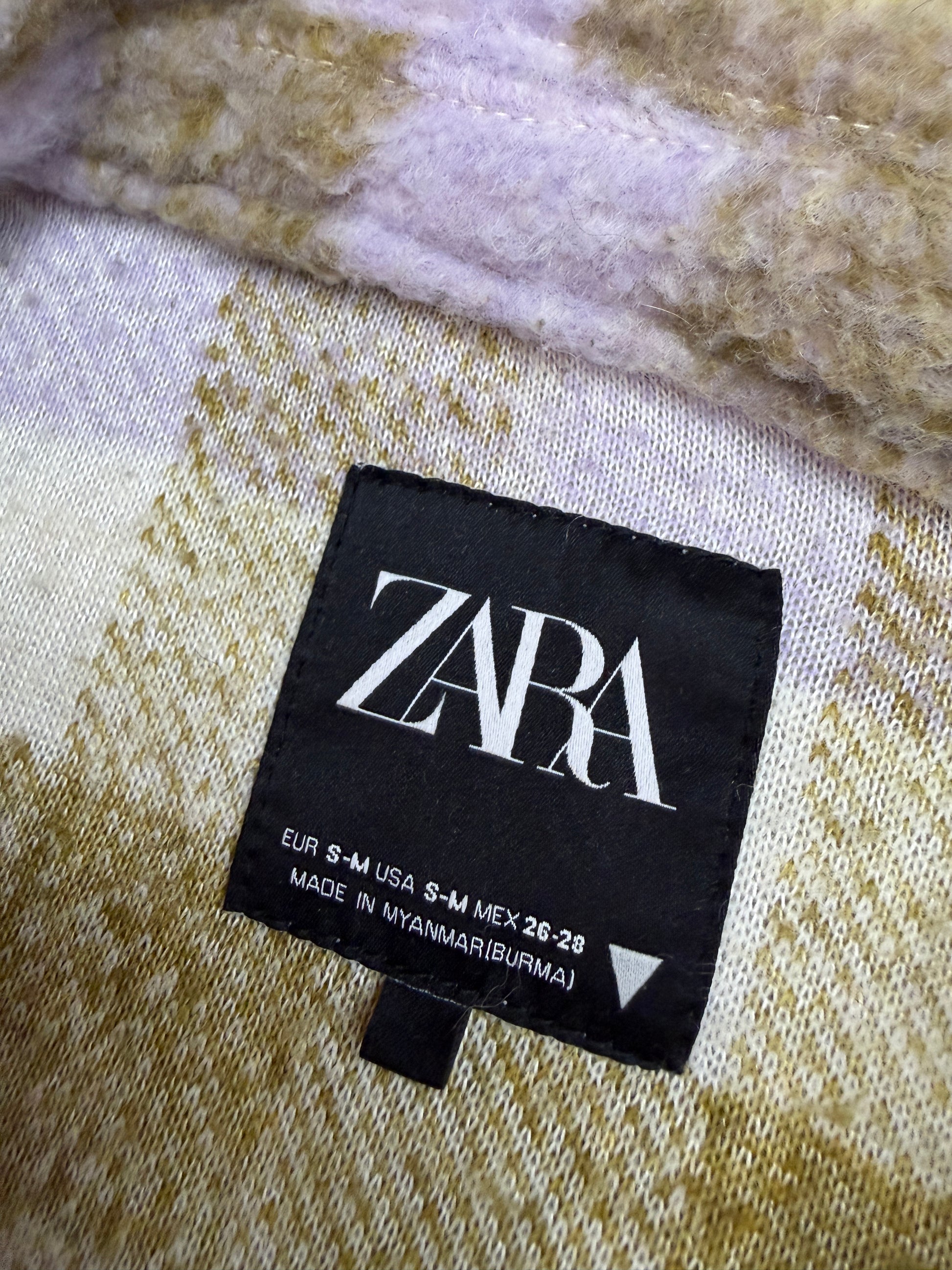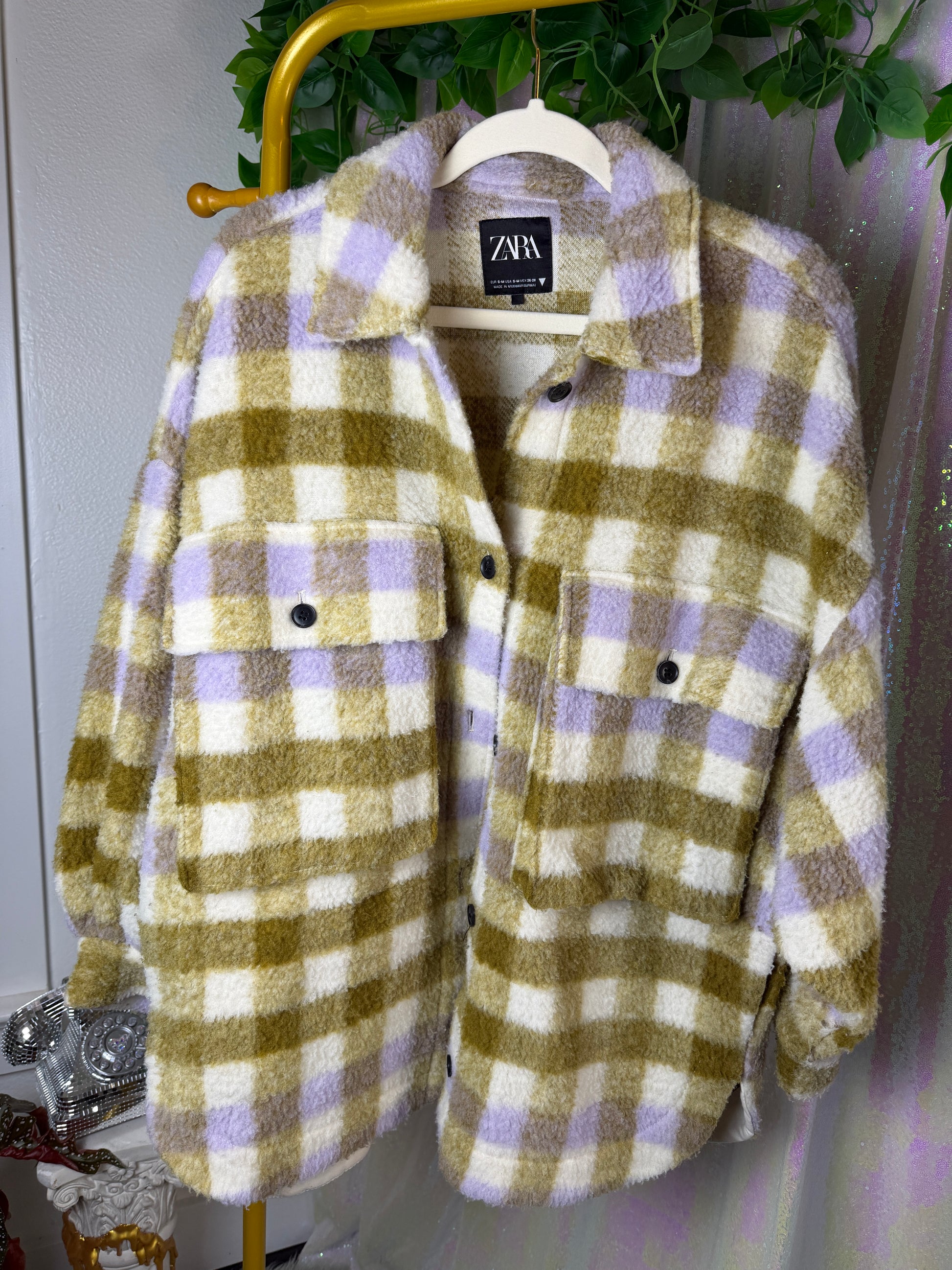 ZARA pastel-olive + lilac plaid sherpa jacket (factory tagged: SโM)