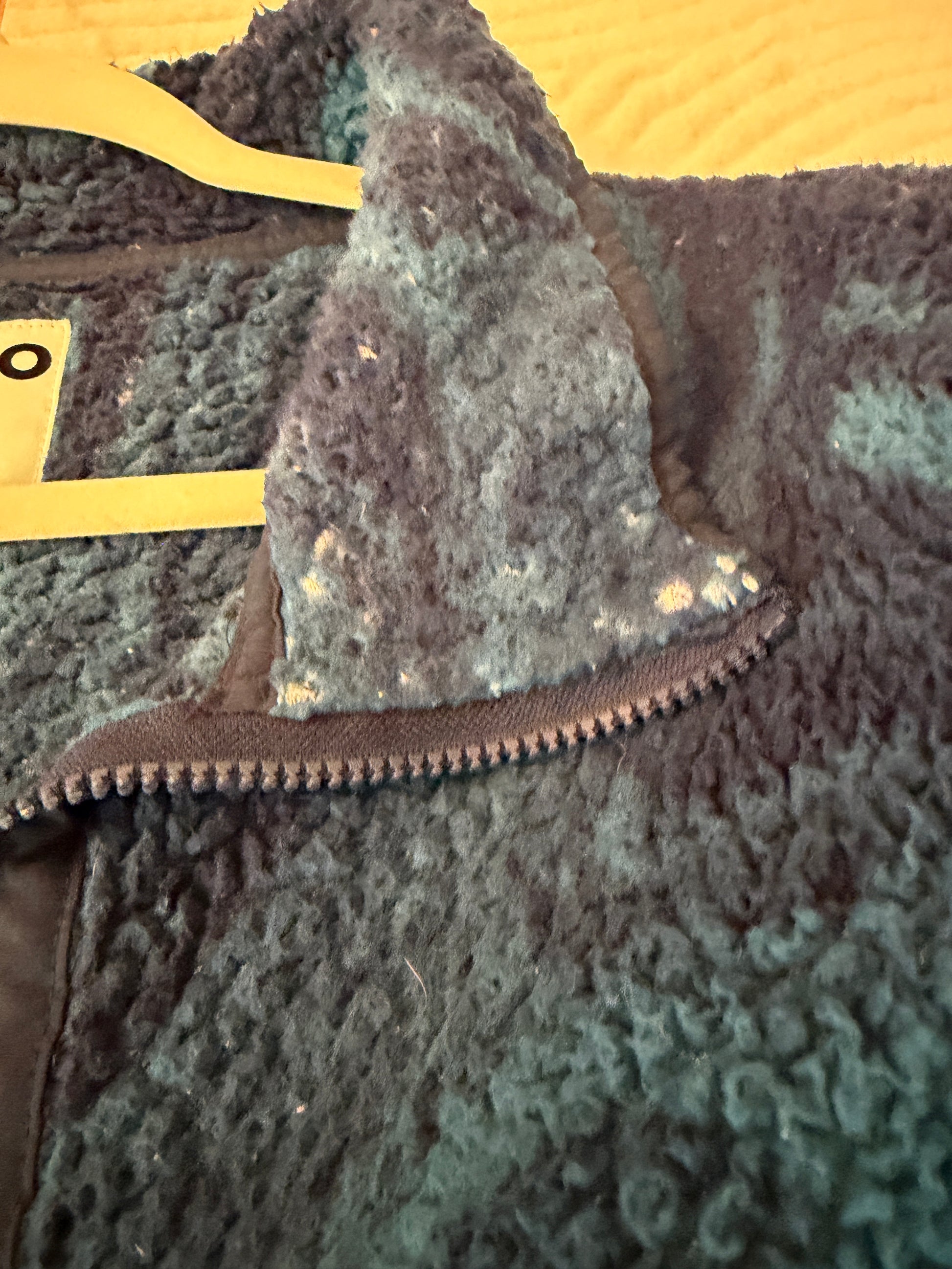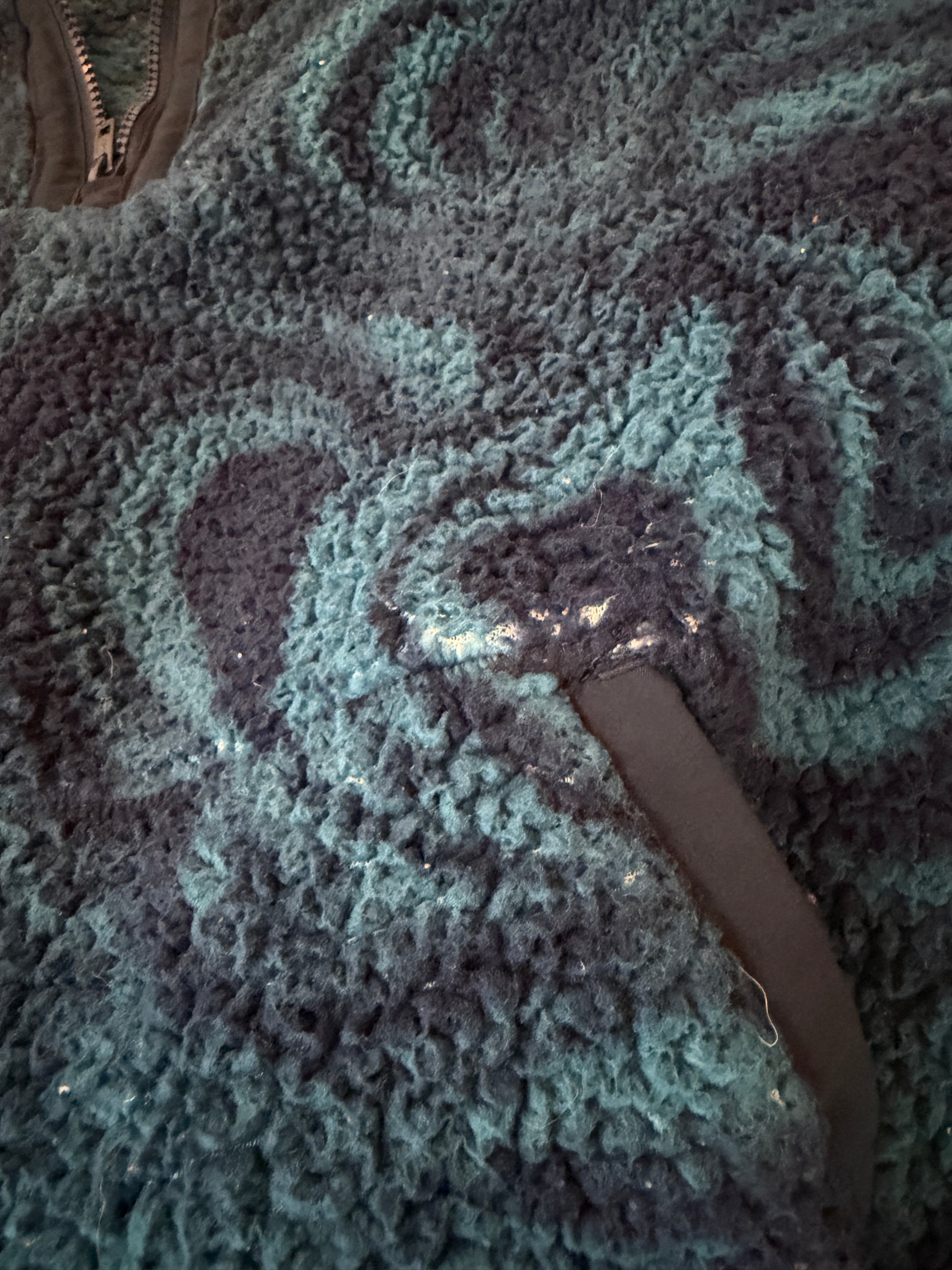 A deep teal swirl fleece with a plush, cloudlike handfeel and a relaxed silhouette. Warm, comforting, and perfect for anyone who loves soft textures with a subtle trippy pattern. ~fleece worn in places~