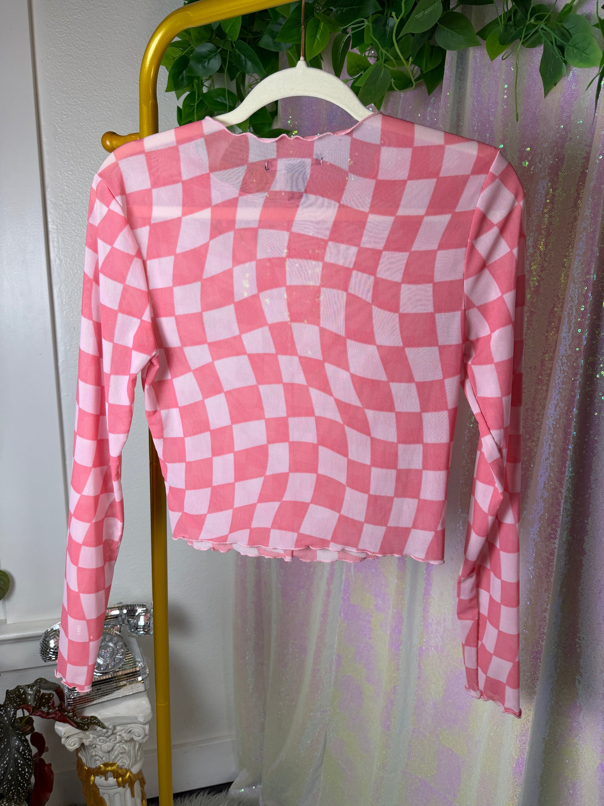 A soft, breathable mesh top in bubblegum checkers. Light and stretchy, perfect for layering or adding a playful visual pop without weight.