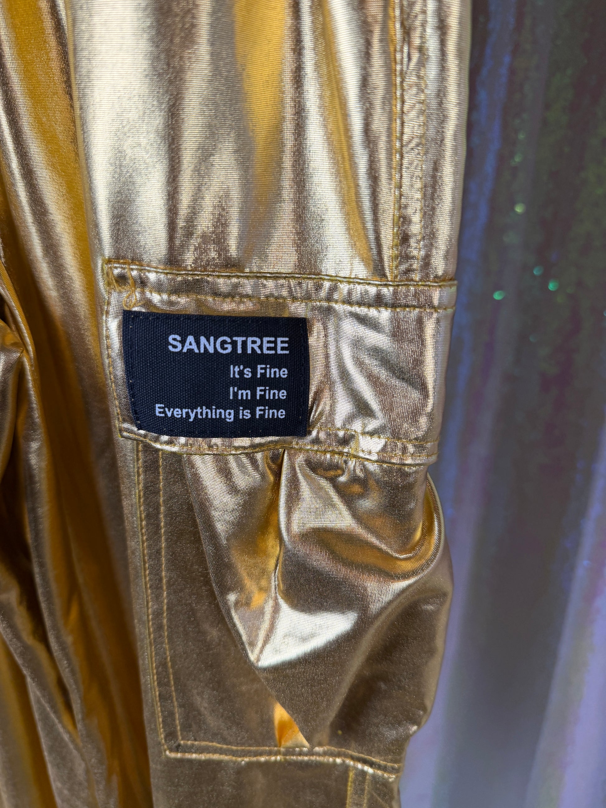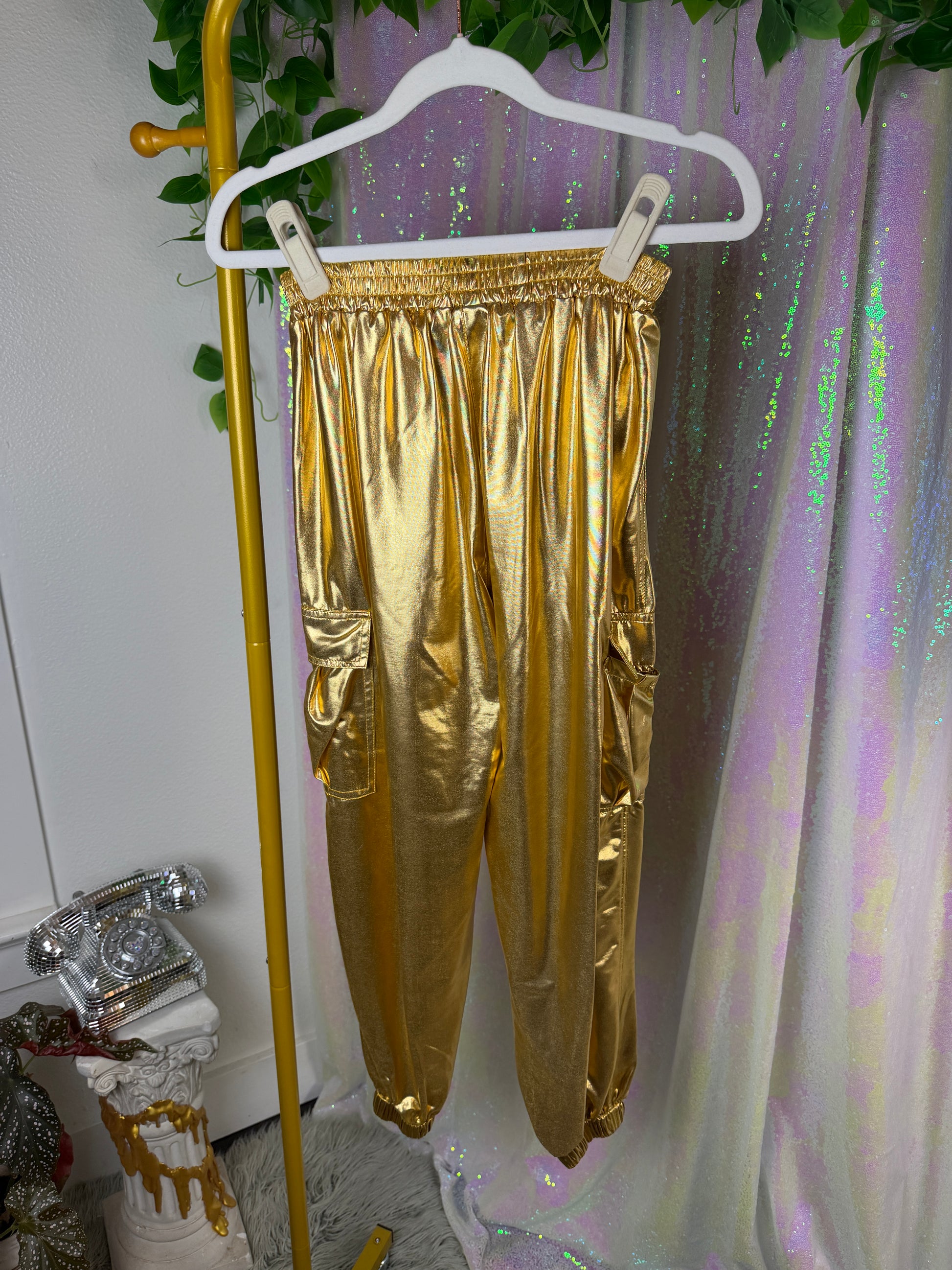 Liquid-gold joggers with a soft interior and glossy exterior built for maximum movement. These catch the light with every step, giving a dance-floor ready shimmer while still feeling comfy and slouchy enough for styled layering.