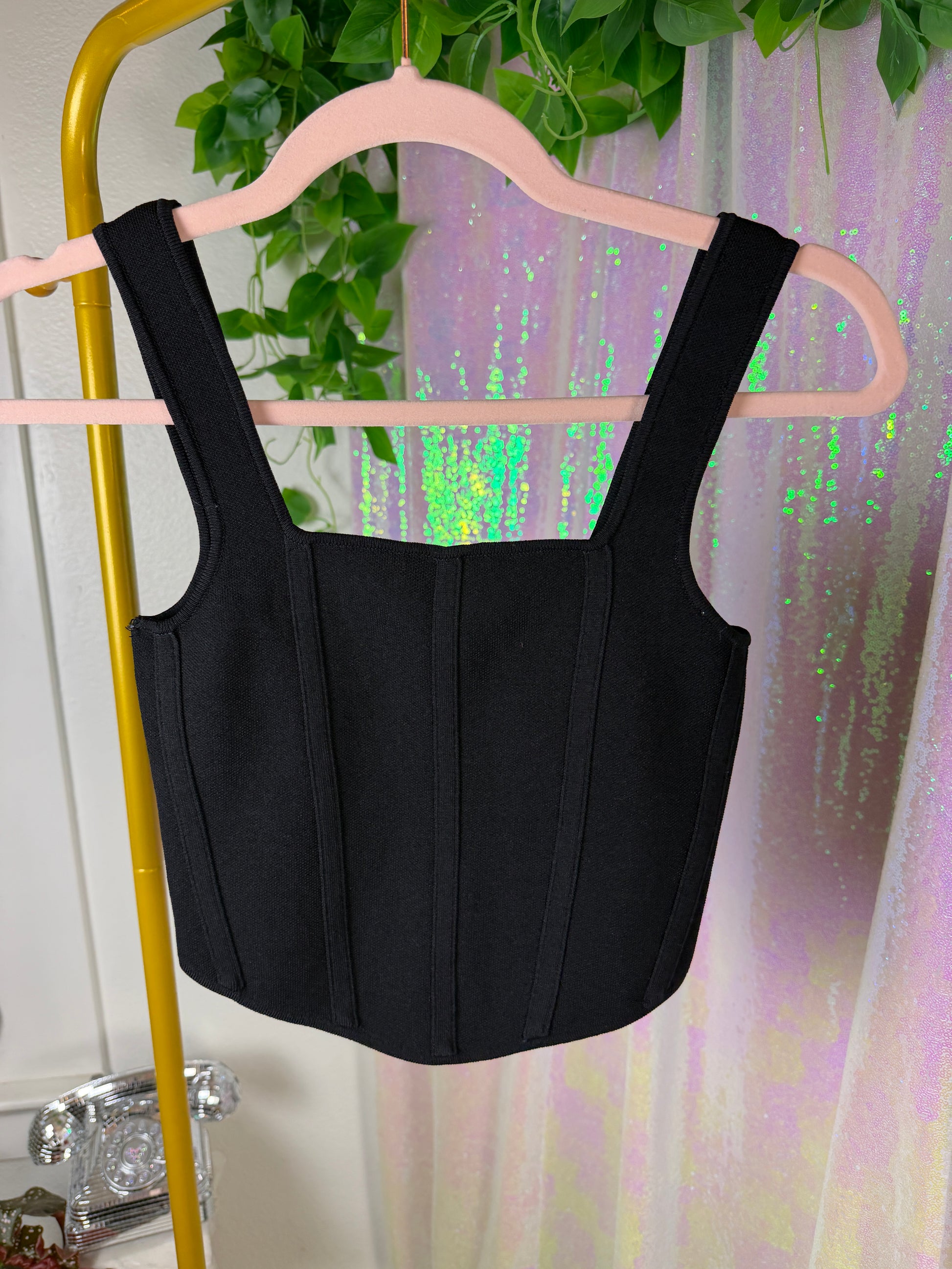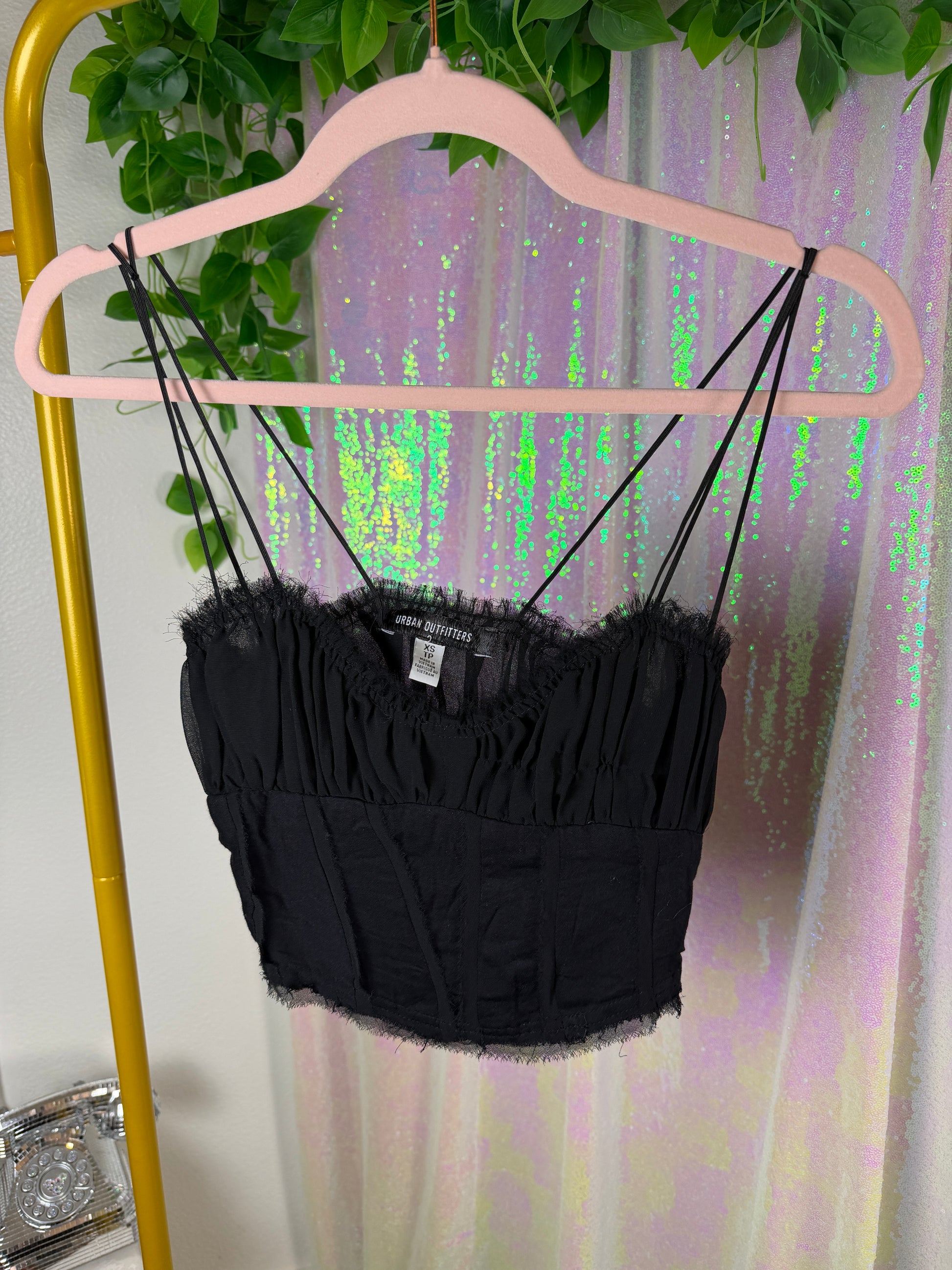 Urban Outfitters black sheer-trim corset top (factory tagged: XS)