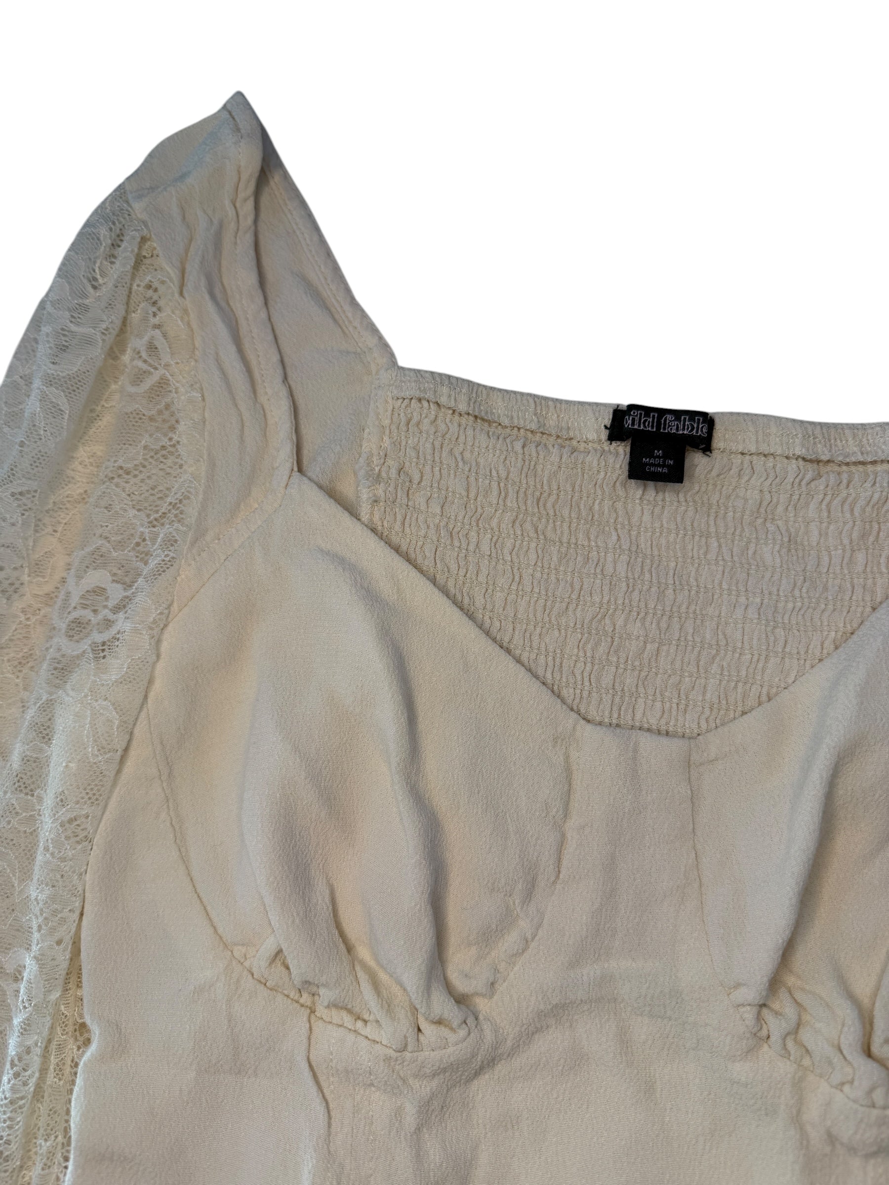 FOREVER21 (M) cream lace long sleeve blouse:ย A delicate, romantic top made of embroidered lace with a cropped faux corset.
