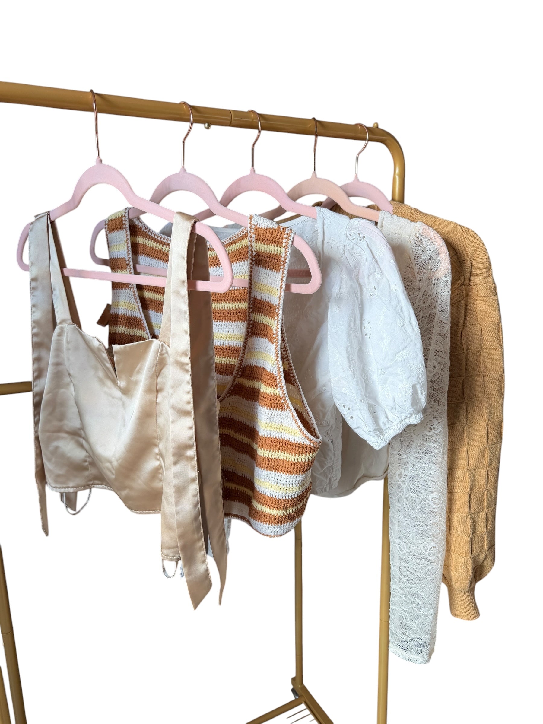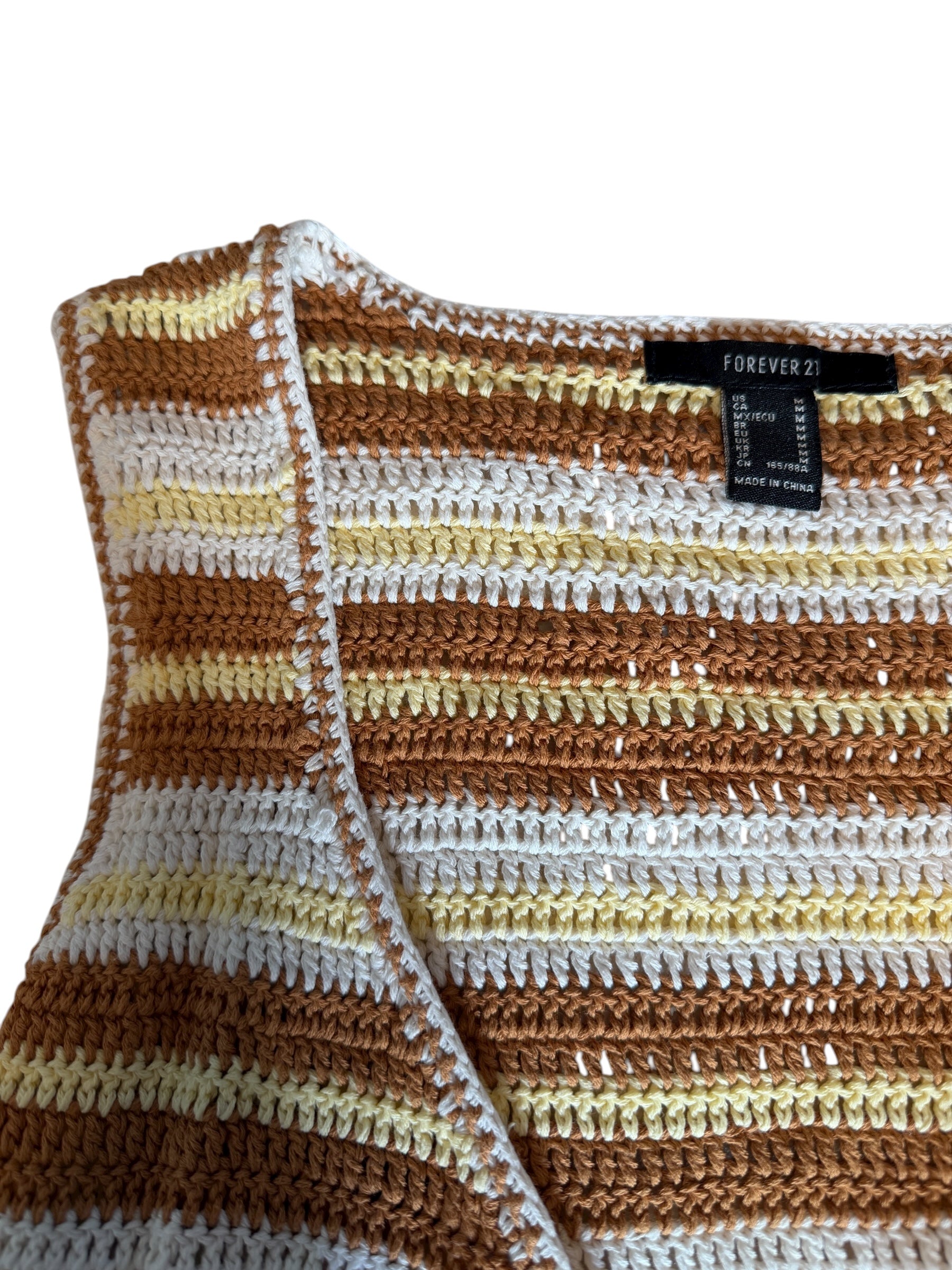 FOREVER21 (M) Striped crochet tank: A hand-knit sleeveless top featuring horizontal stripes in warm tones of tan, white, and rust for a cozy retro vibe.