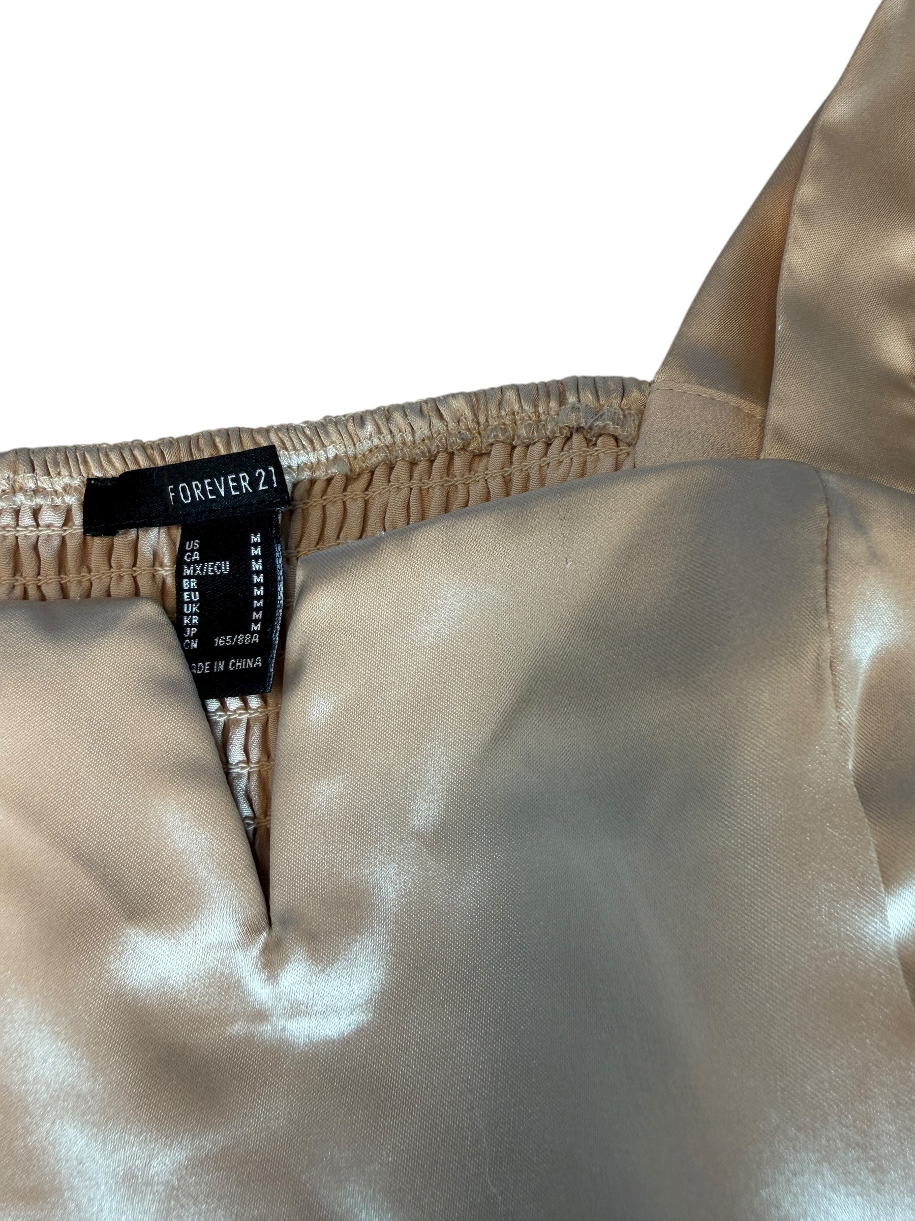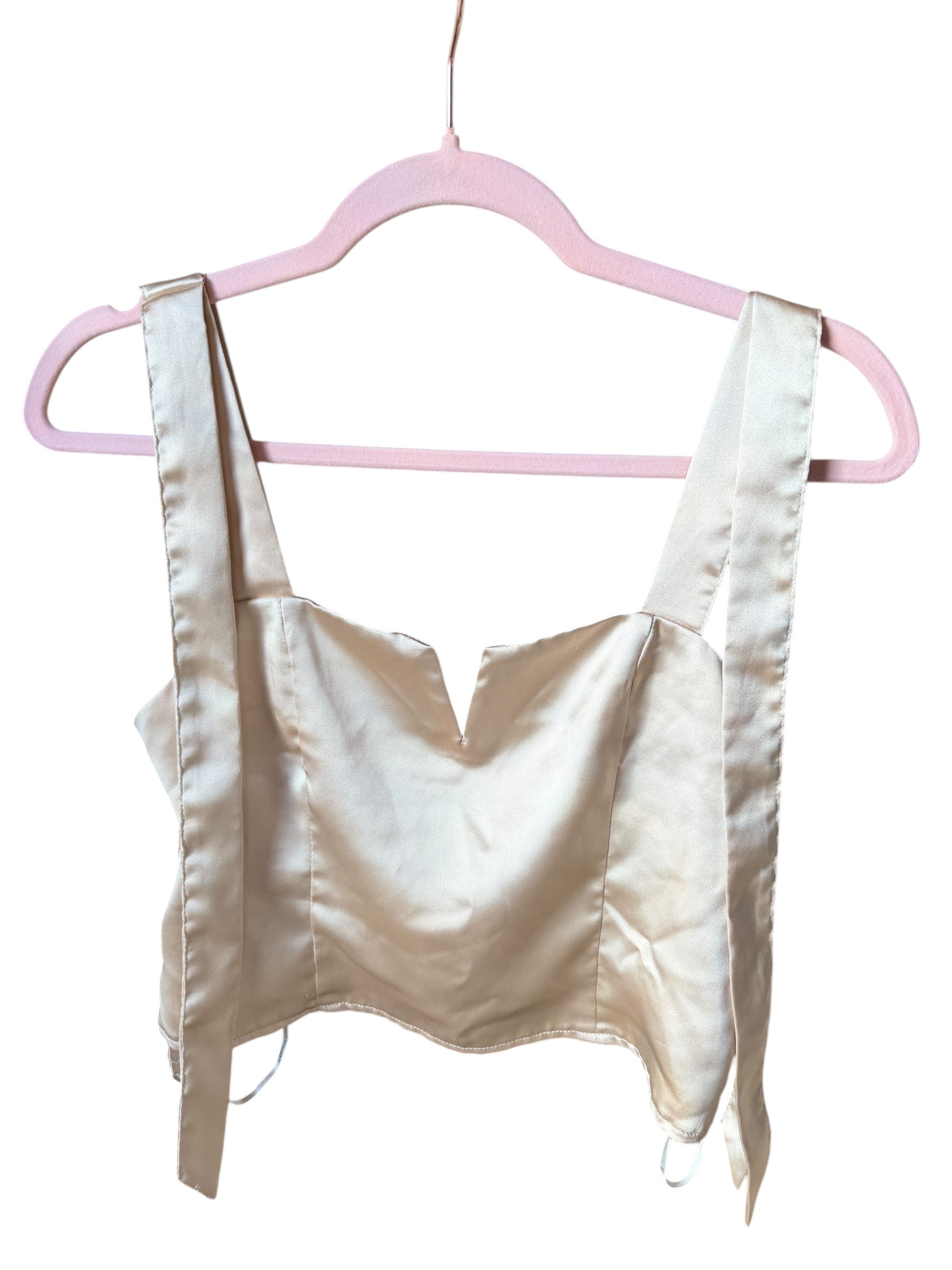 FOREVER21 (M) Satin tie-top: A silky champagne-colored cropped top with wide shoulder straps and long ties that wrap around the waist for a feminine, adjustable fit.