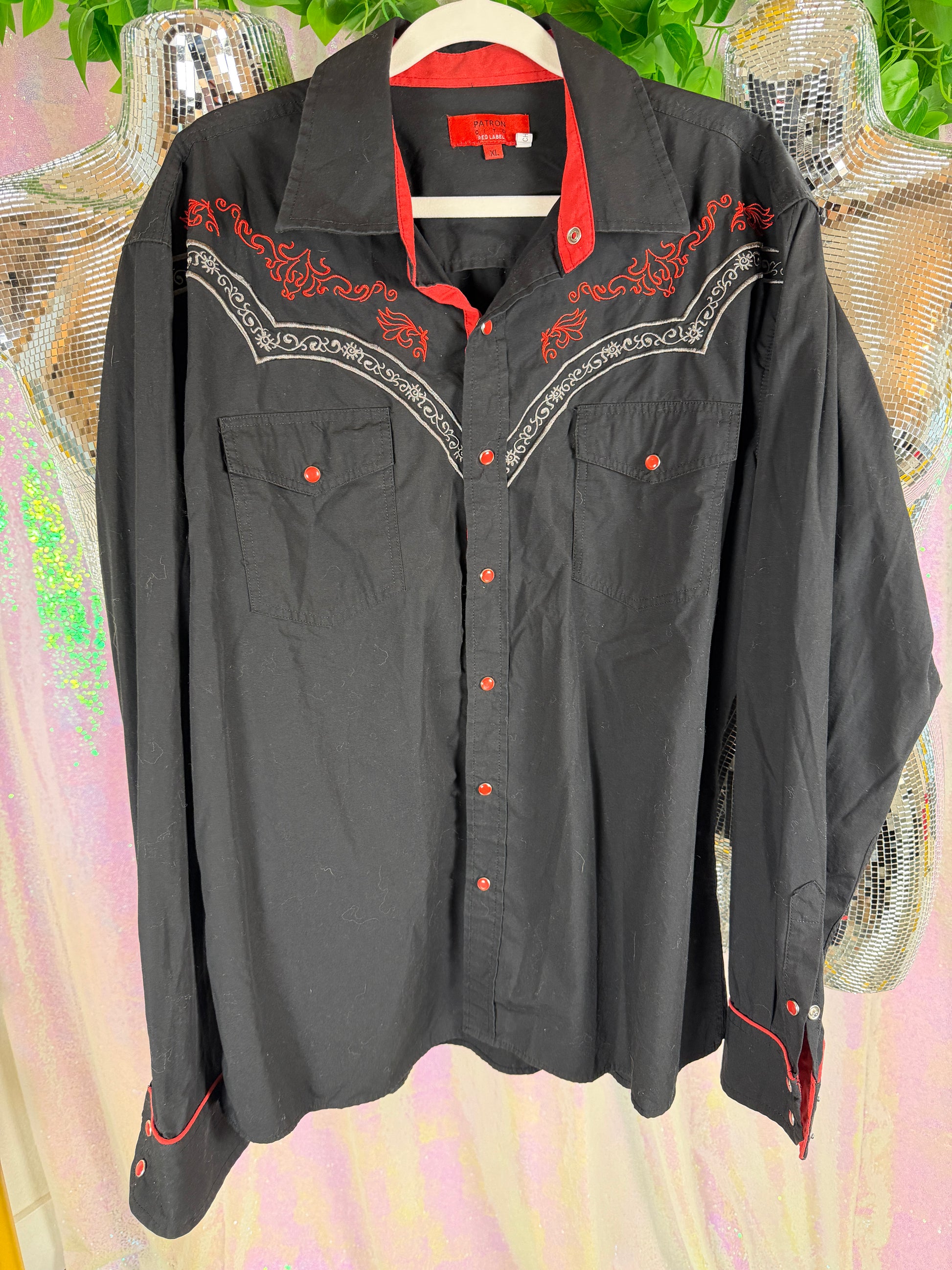 Structured but wearable with a broken-in feel, this early-2000s western shirt features sharp red snap buttons, contrast piping, and flame-style embroidery across the chest for bold, graphic impact. Easy to wear buttoned clean or layered open—serving dark Americana, alt cowboy, and lowkey stage-ready energy without feeling costume-y.