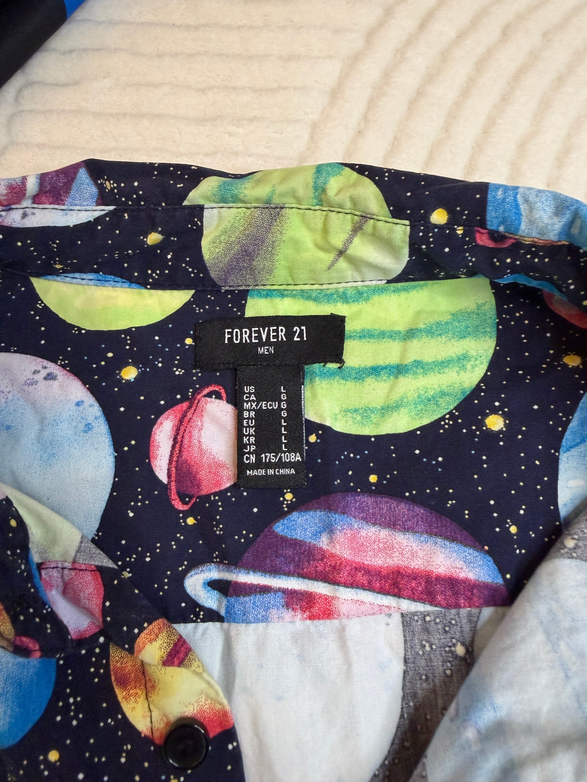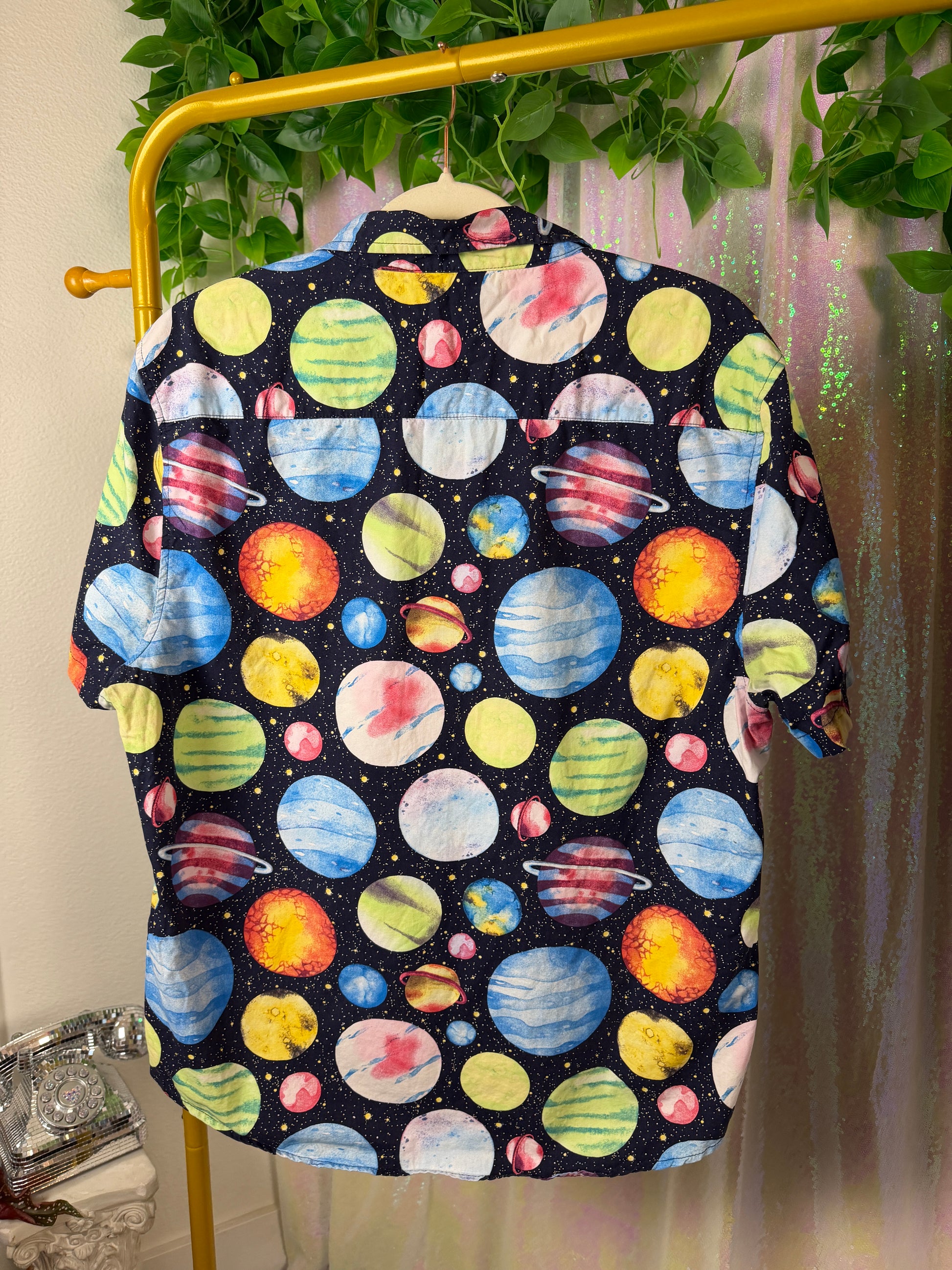 A soft, lightweight button-up covered in watercolor planets and starry details. The fabric moves easily and feels airy, giving a fun, curious vibe without feeling costume-y โ just bright, spacey, and relaxed.