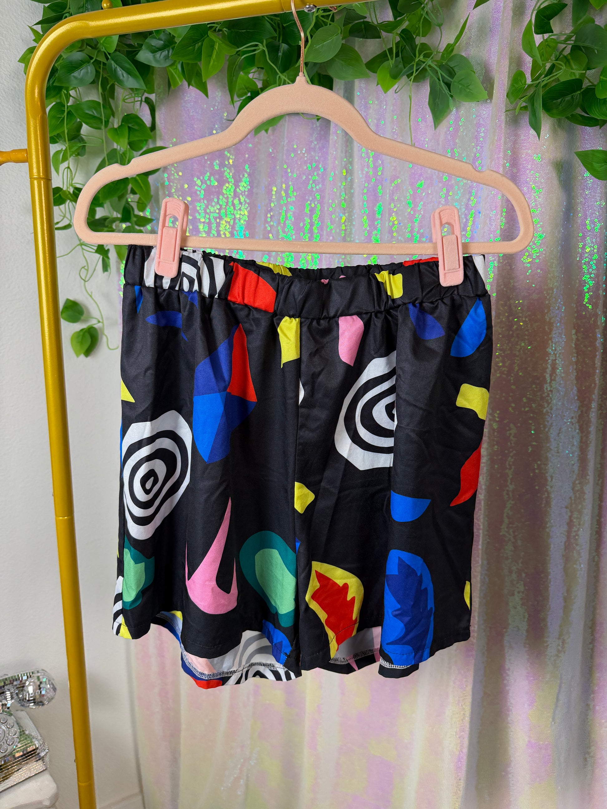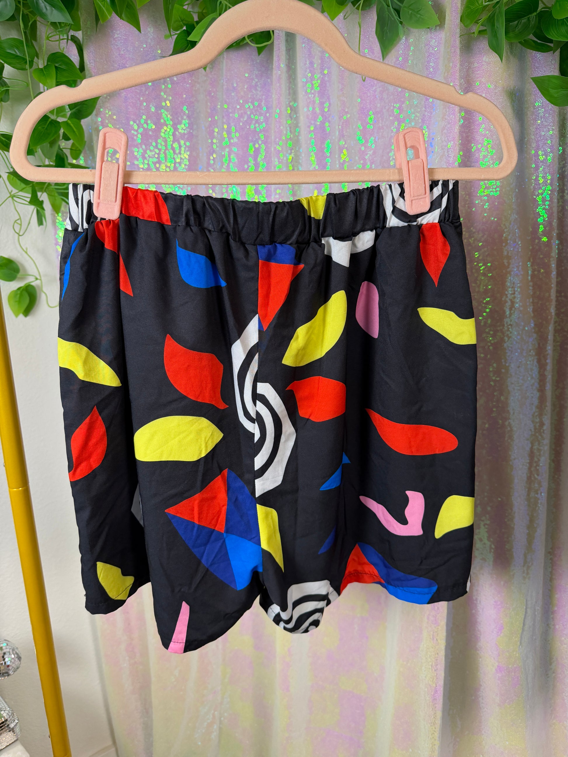 Flowy black shorts with bright geometric shapes and a comfortable elastic waist. They feel breezy and effortless, adding motion and pop to any outfit without adding bulk or weight.
