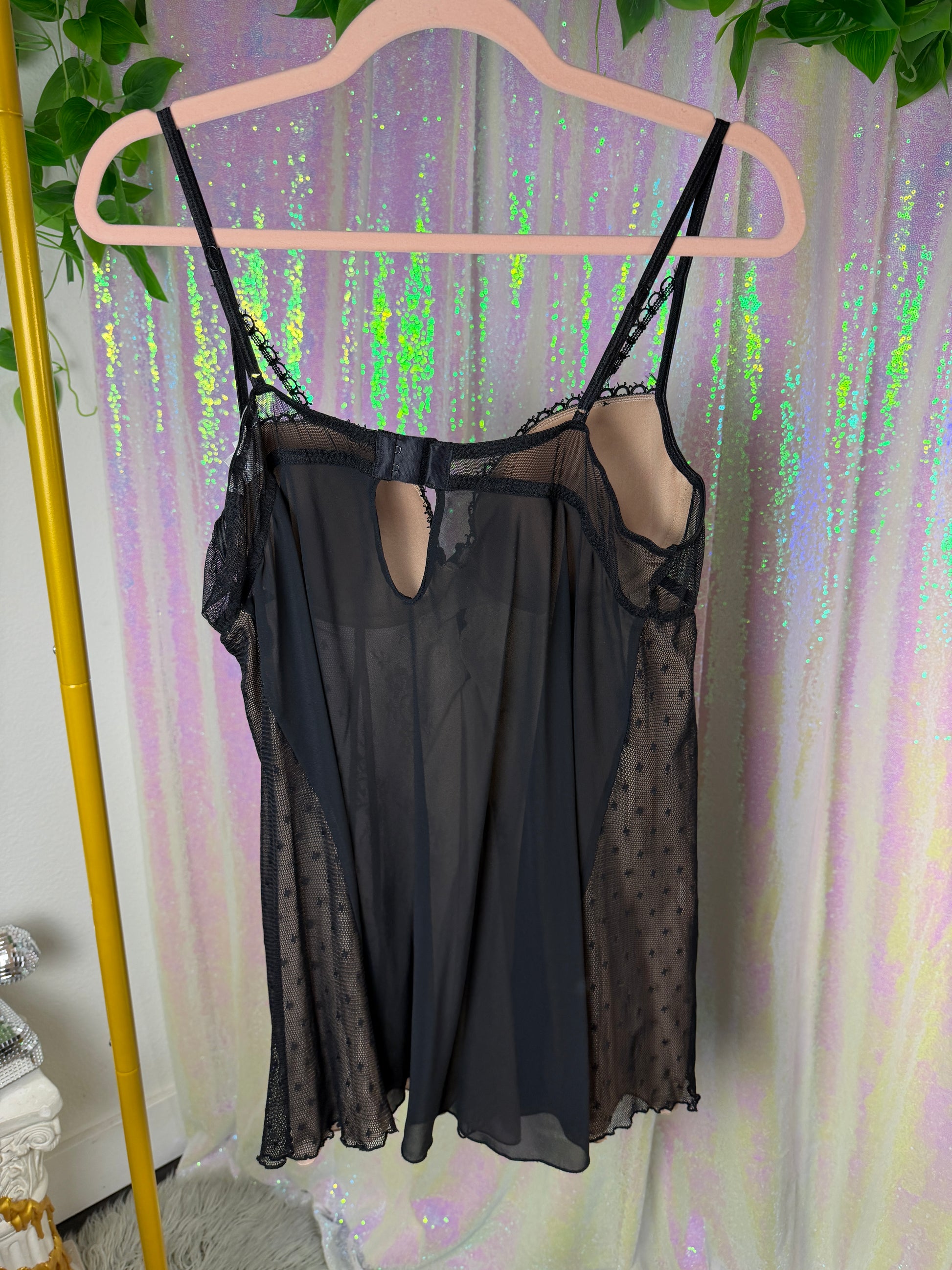 A romantic mesh slip with soft-cup shaping, embroidered florals, and a dotted tulle overlay that reads both vintage and nightlife-ready. Lightweight with a floaty drape, it layers beautifully over a bralette or under an oversized jacket for a moody textural moment. Gives off soft-goth, dance-friendly energy with a little 90s lingerie nostalgia.