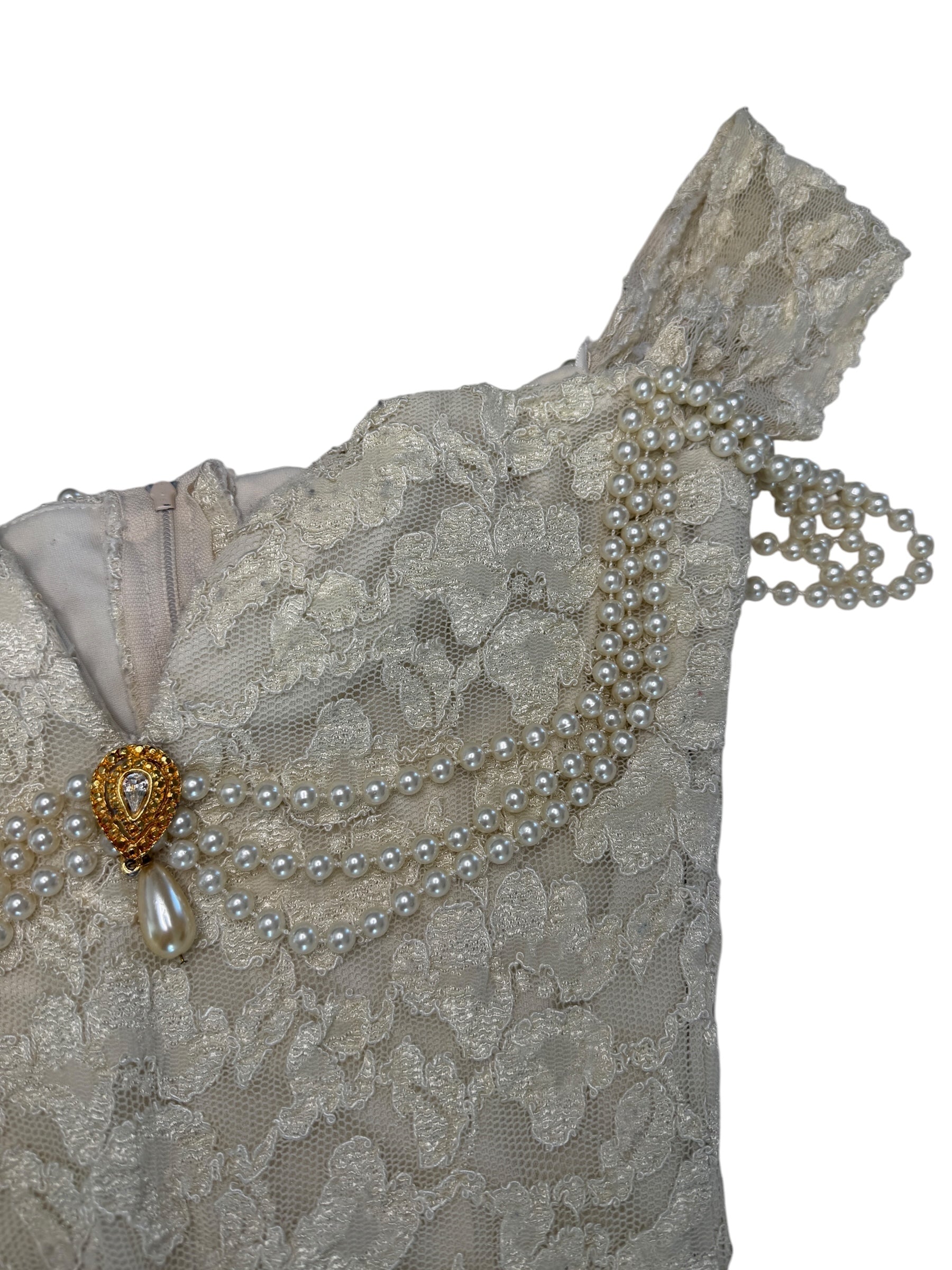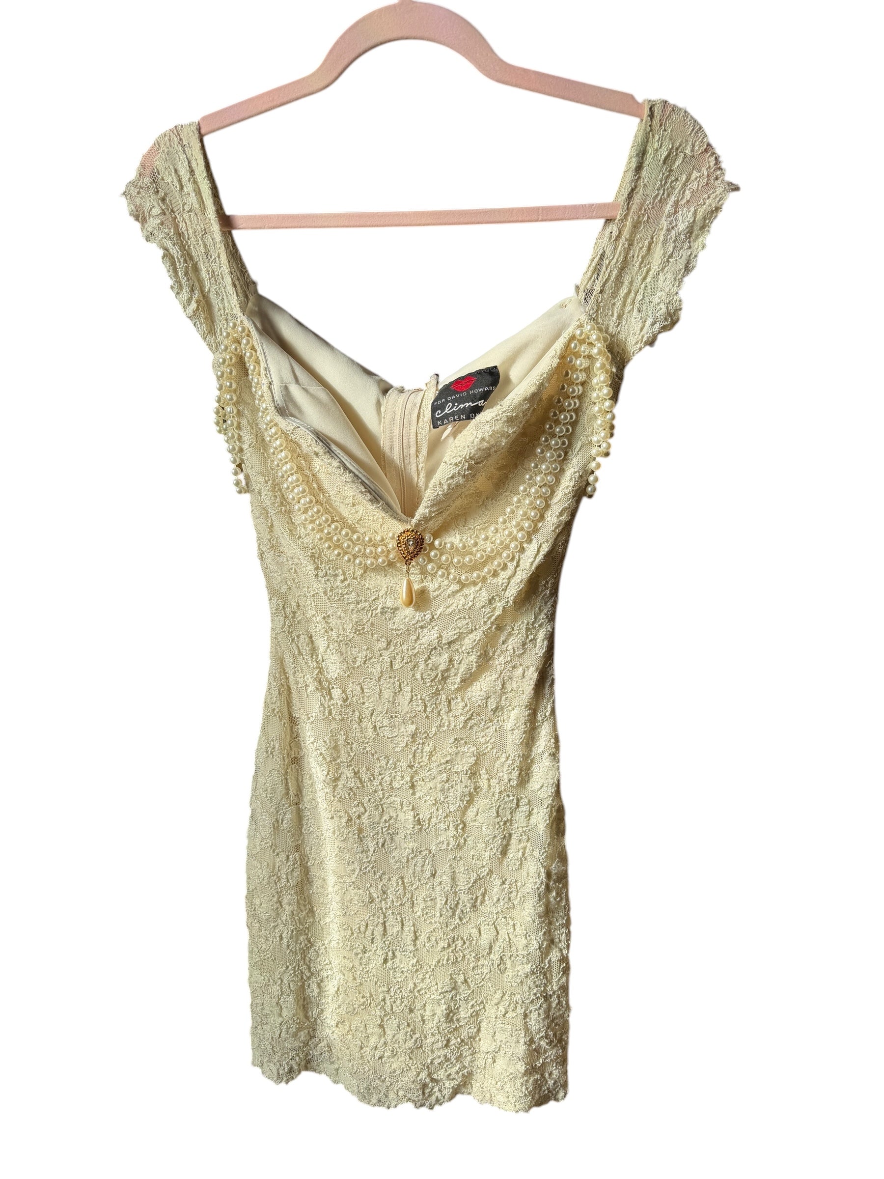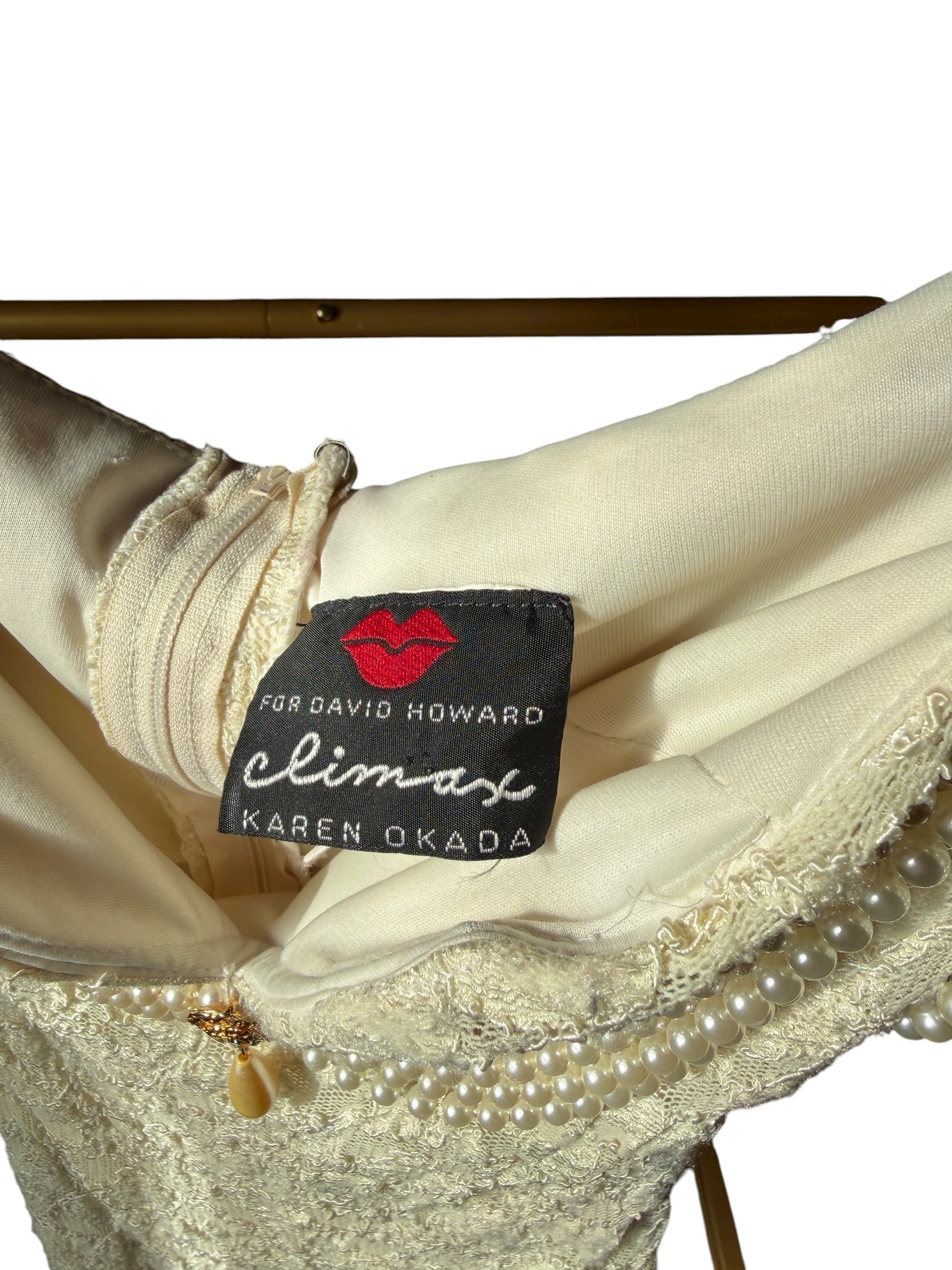 FOR DAVID HOWARD climax KAREN OKADA (S) - Off-the-shoulder- dripping in pearls cream Lace Dress: The “soft but dangerous” one. Golden hour personified. If a love spell had a dress code, it’d be this one.